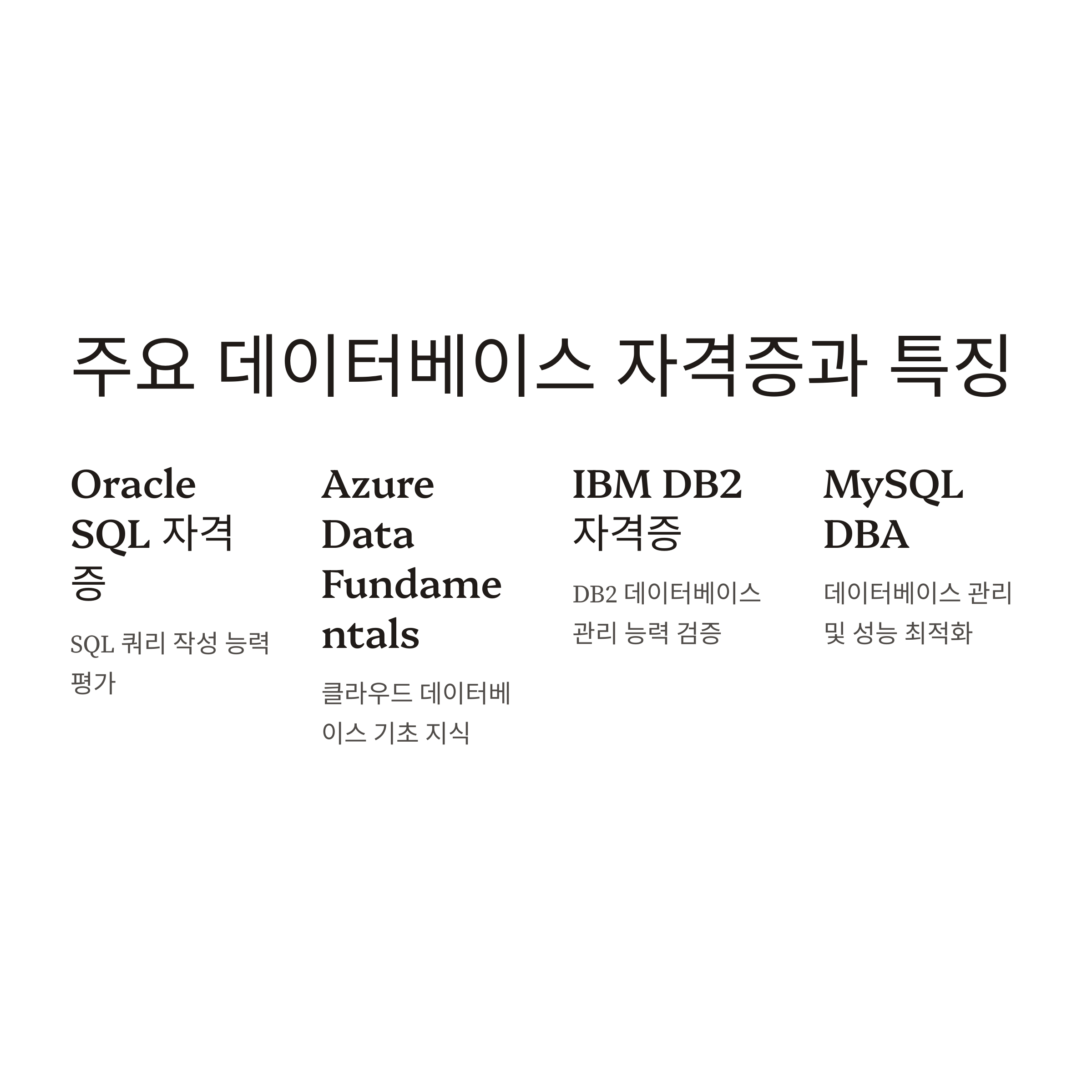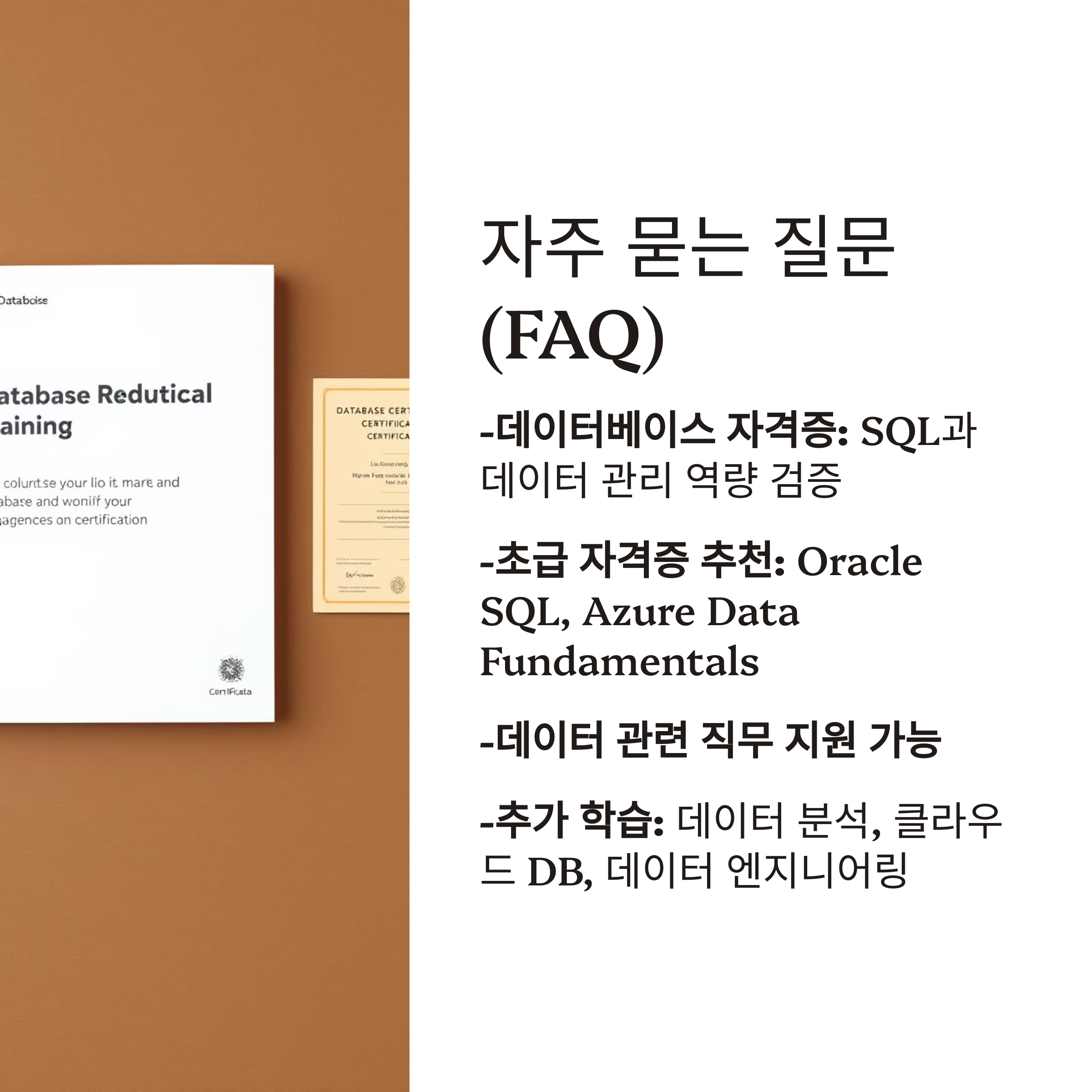 A2. Oracle Database SQL Certified Associate나 Microsoft Azure Data Fundamentals 같은 초급 자격증부터 시작하는 것이 좋습니다.