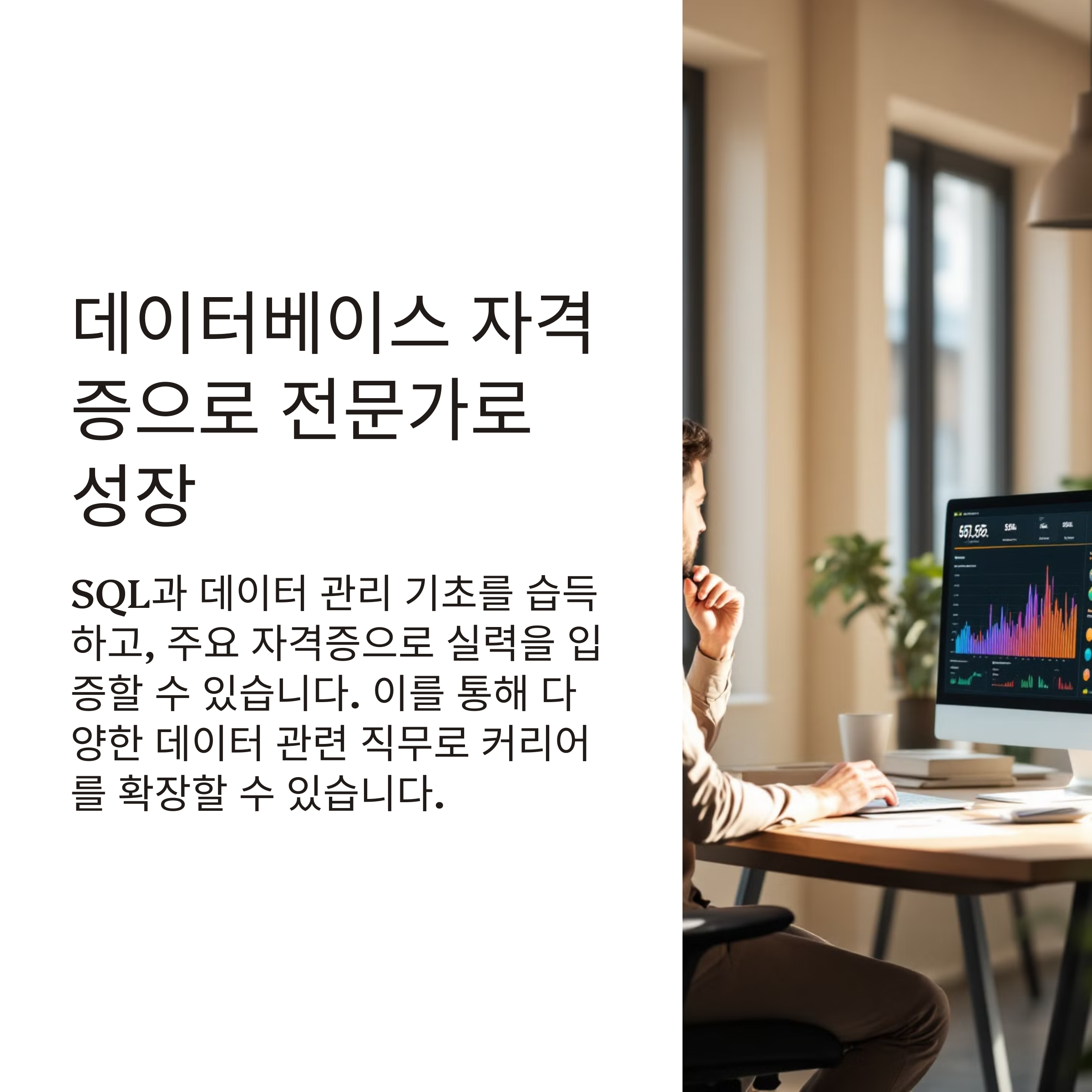 오늘날 기업들은 효율적인 데이터 관리를 위해 데이터베이스 전문가를 필요로 합니다. 데이터베이스 자격증을 취득하면, 데이터베이스 관리 능력과 SQL 실력을 검증받아 데이터베이스 관리자(DBA), 데이터 엔지니어, 데이터 분석가 등 데이터 관련 직무로 진출할 수 있습니다.