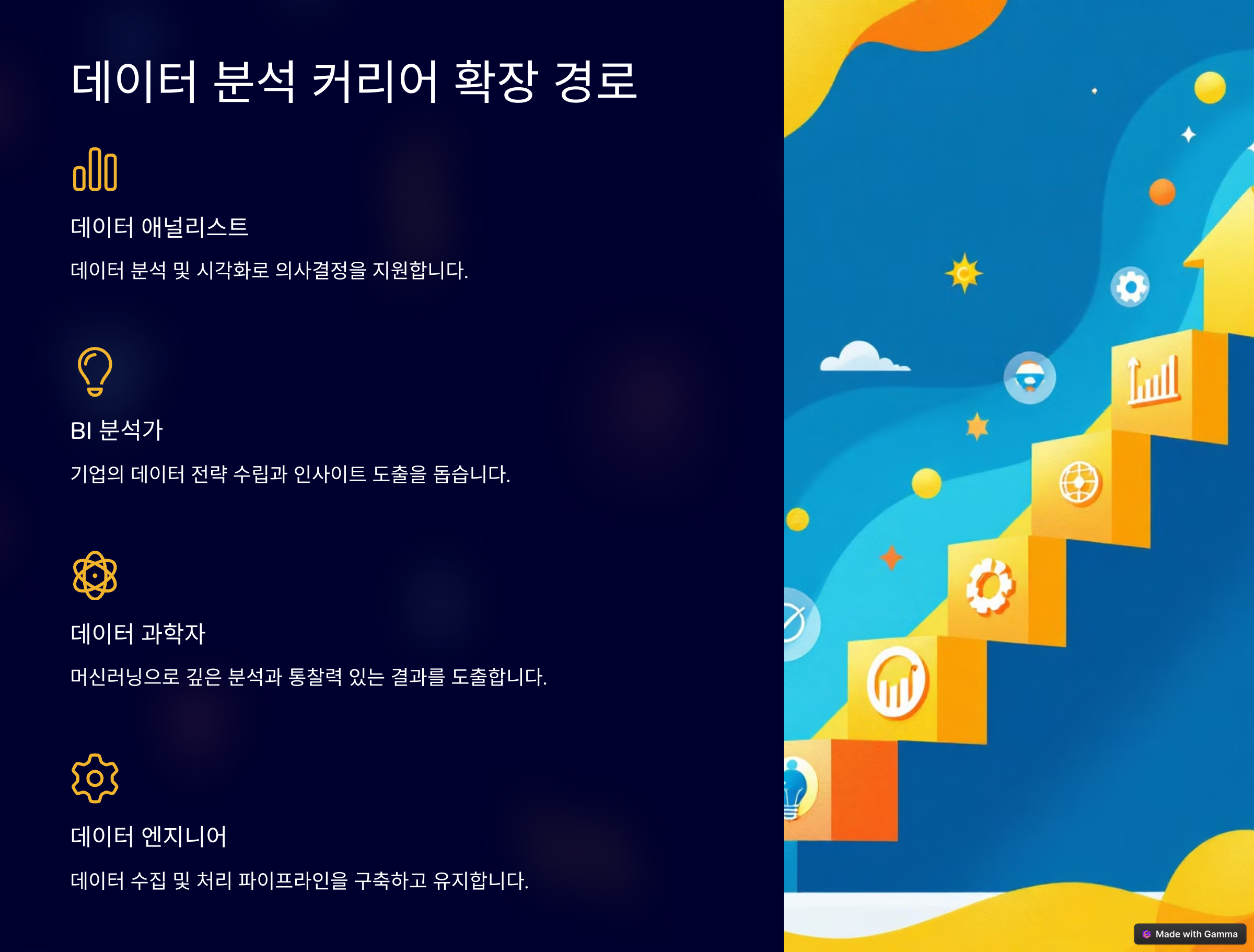 - 비즈니스 인텔리전스 분석가: 기업의 데이터 전략 수립과 인사이트 도출을 돕는 역할을 수행합니다.