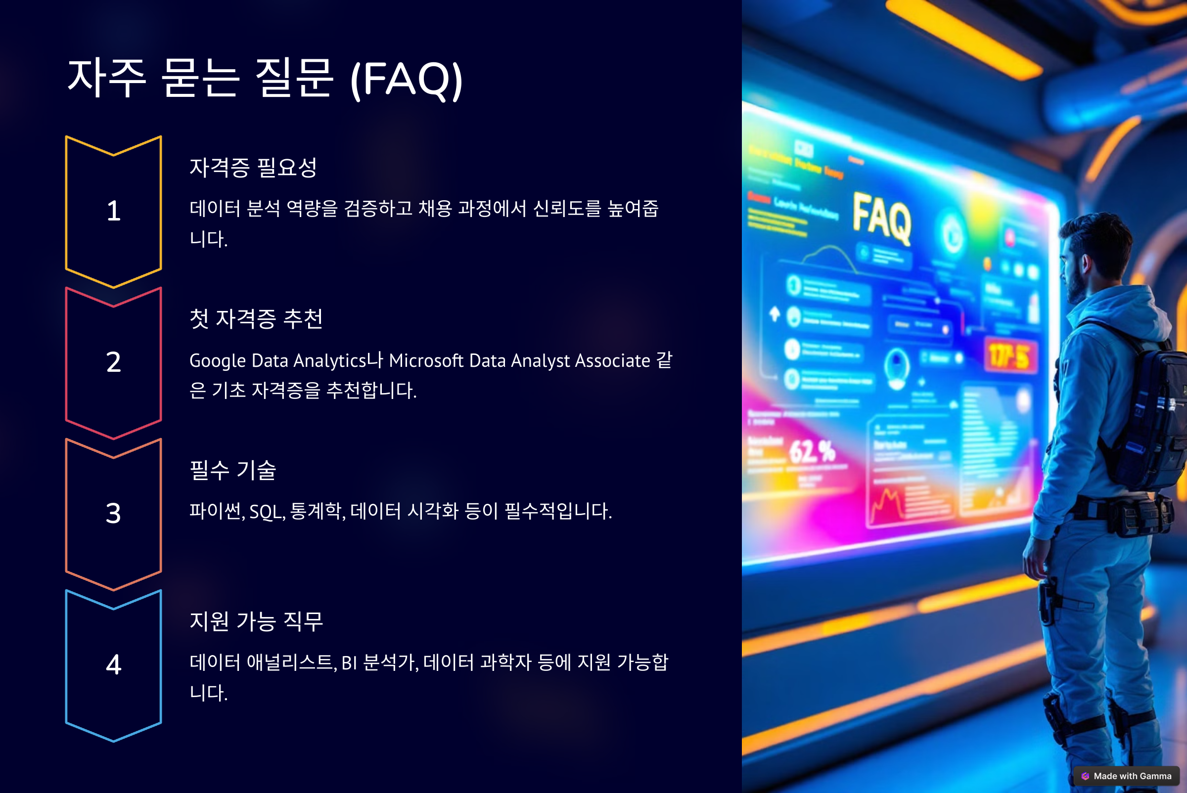A1. 자격증은 데이터 분석 역량을 검증하는 데 도움이 되며, 채용 과정에서 신뢰도를 높여줄 수 있습니다. 특히 경력 초기 단계에서는 도움이 될 수 있습니다.