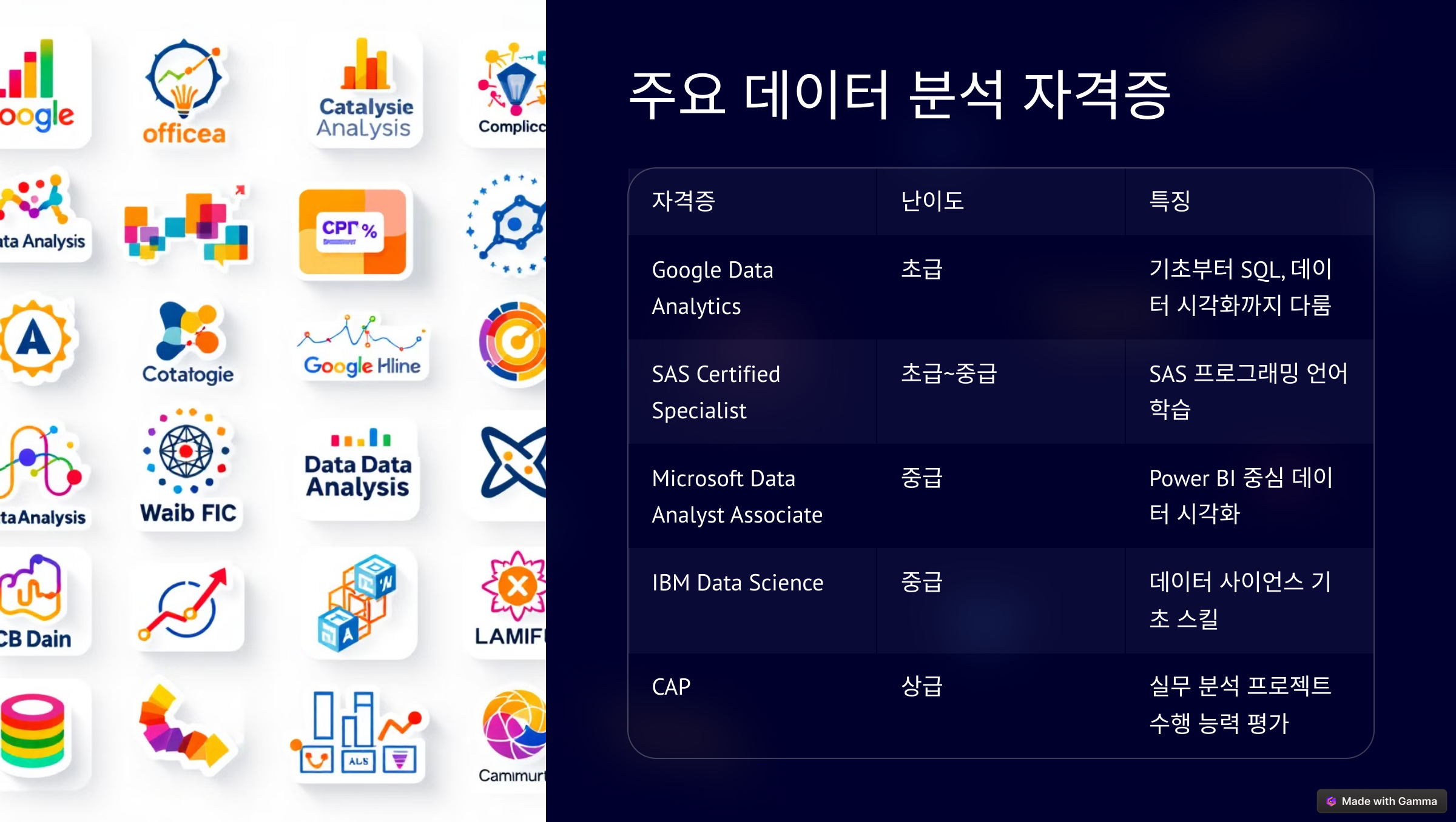 - 특징: 구글에서 제공하는 기초 수준의 데이터 분석 자격증으로, 데이터 분석의 기초부터 SQL, 데이터 시각화까지 다양한 주제를 다룹니다.