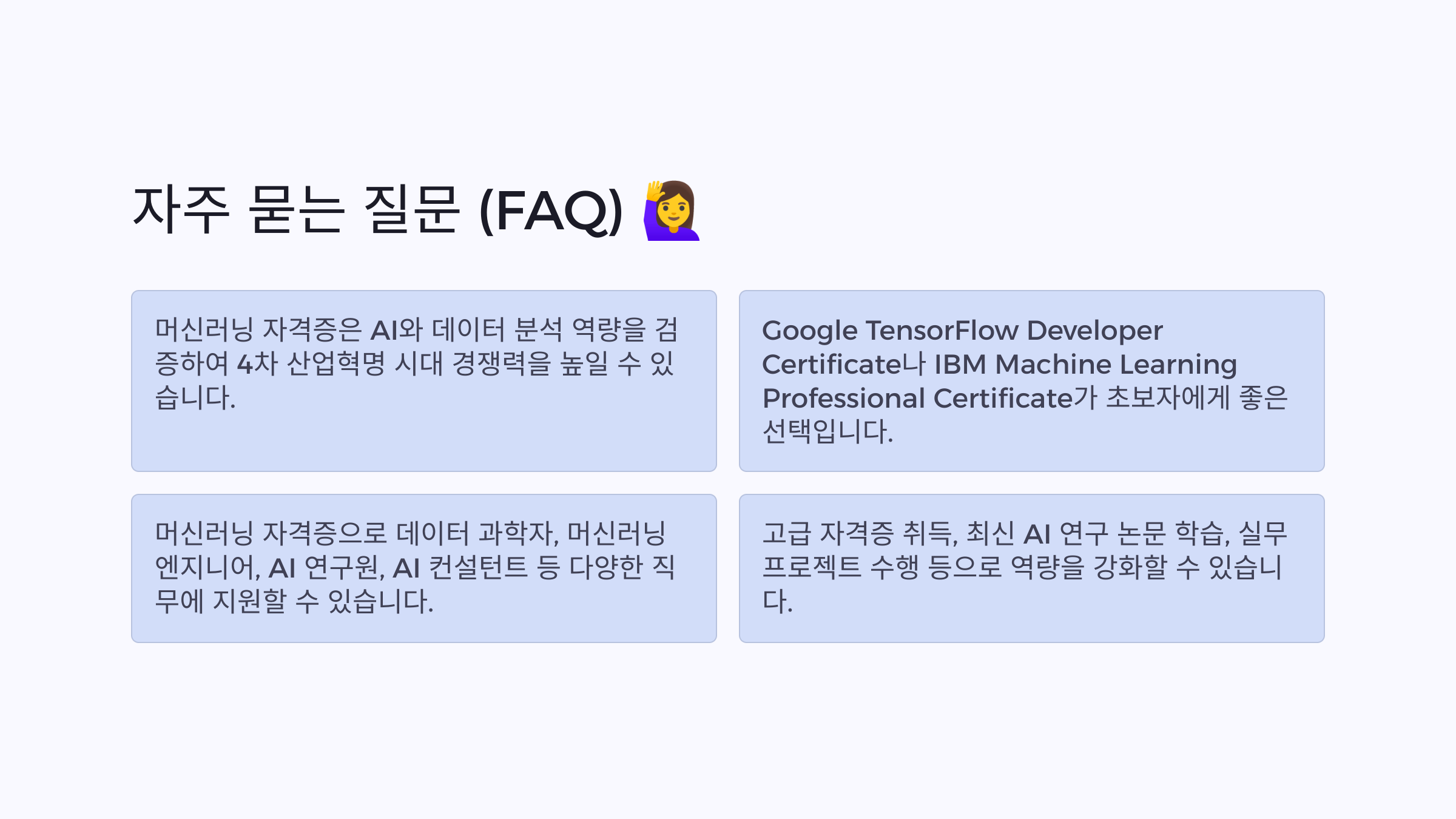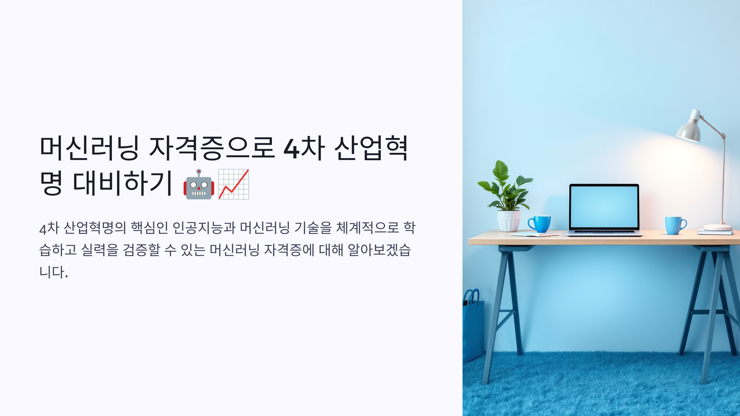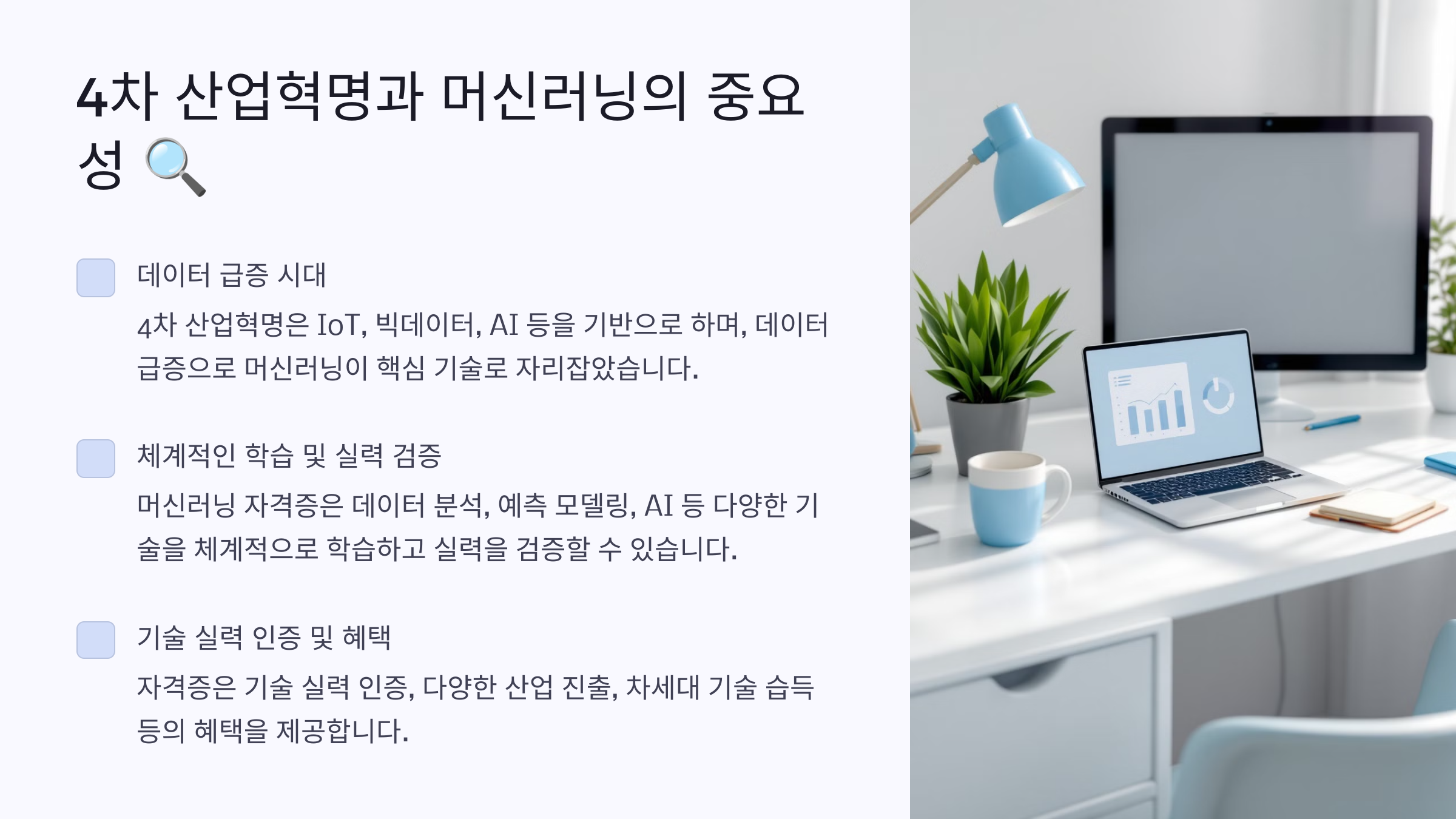 A1. 머신러닝 자격증은 AI 및 데이터 분석 역량을 검증하여 4차 산업혁명 시대에 경쟁력을 갖추는 데 도움이 됩니다.