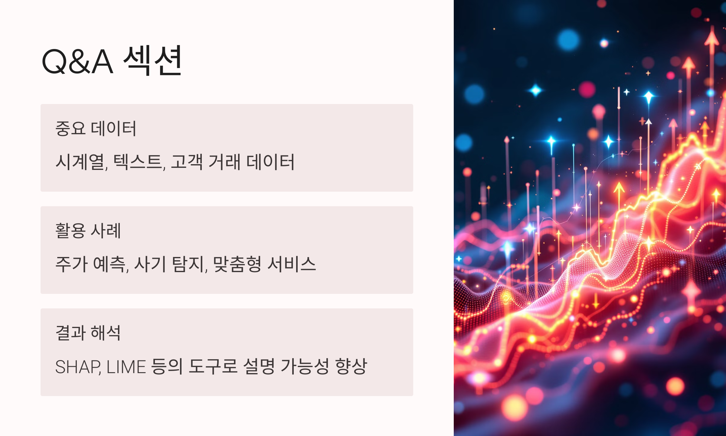 - 시계열 데이터(주가, 환율), 텍스트 데이터(뉴스, 보고서), 고객 거래 데이터 등이 중요합니다.