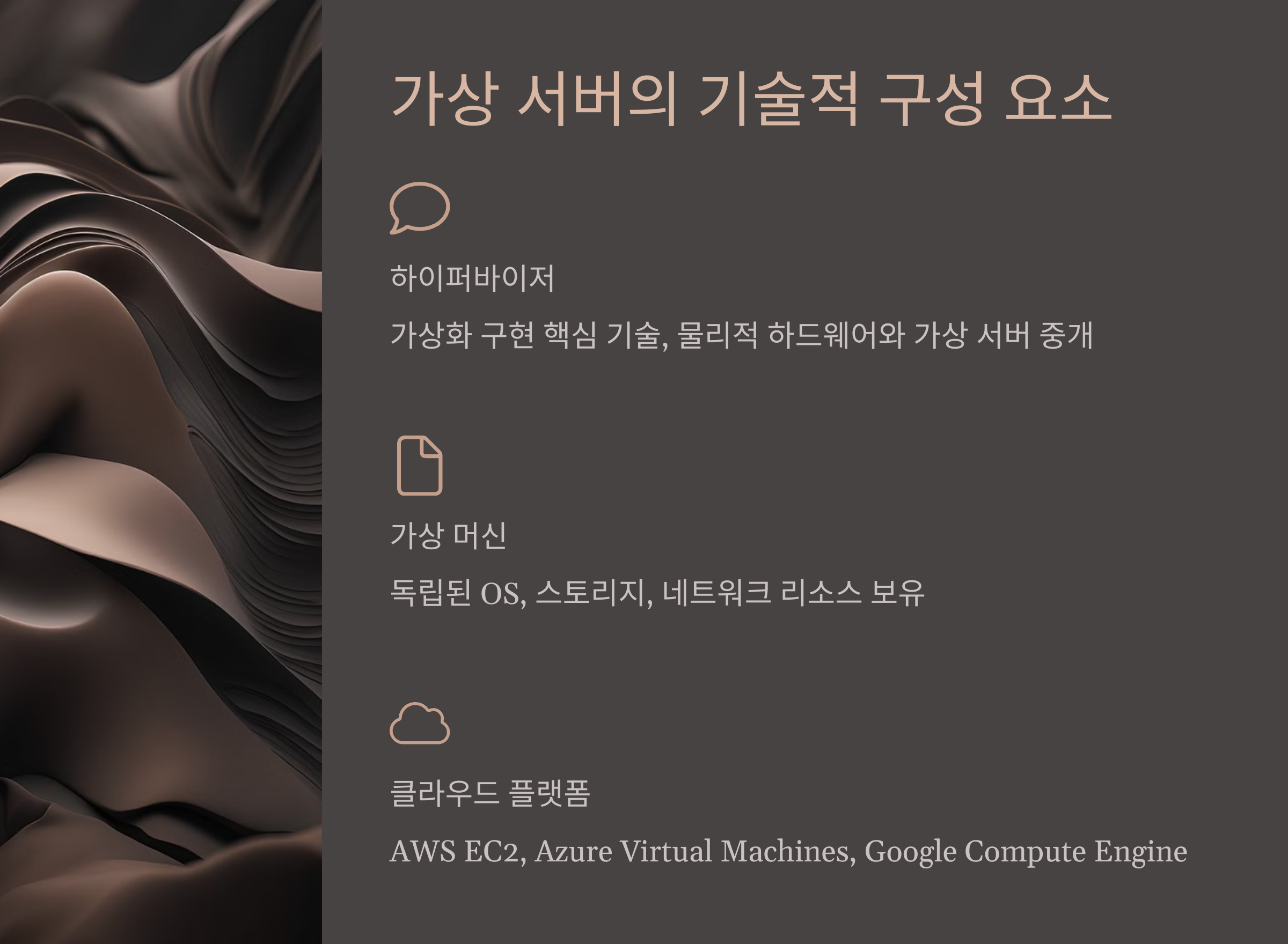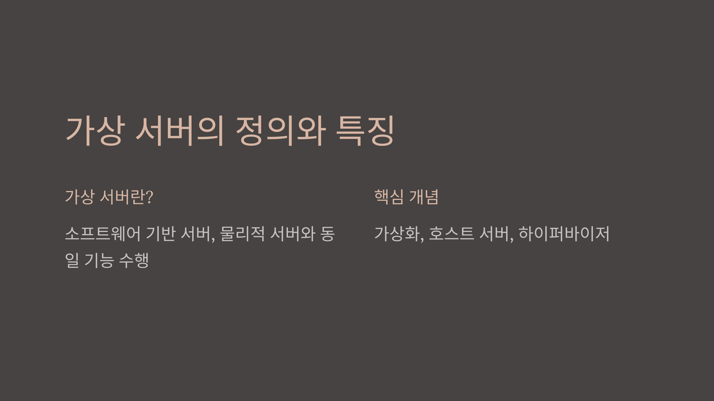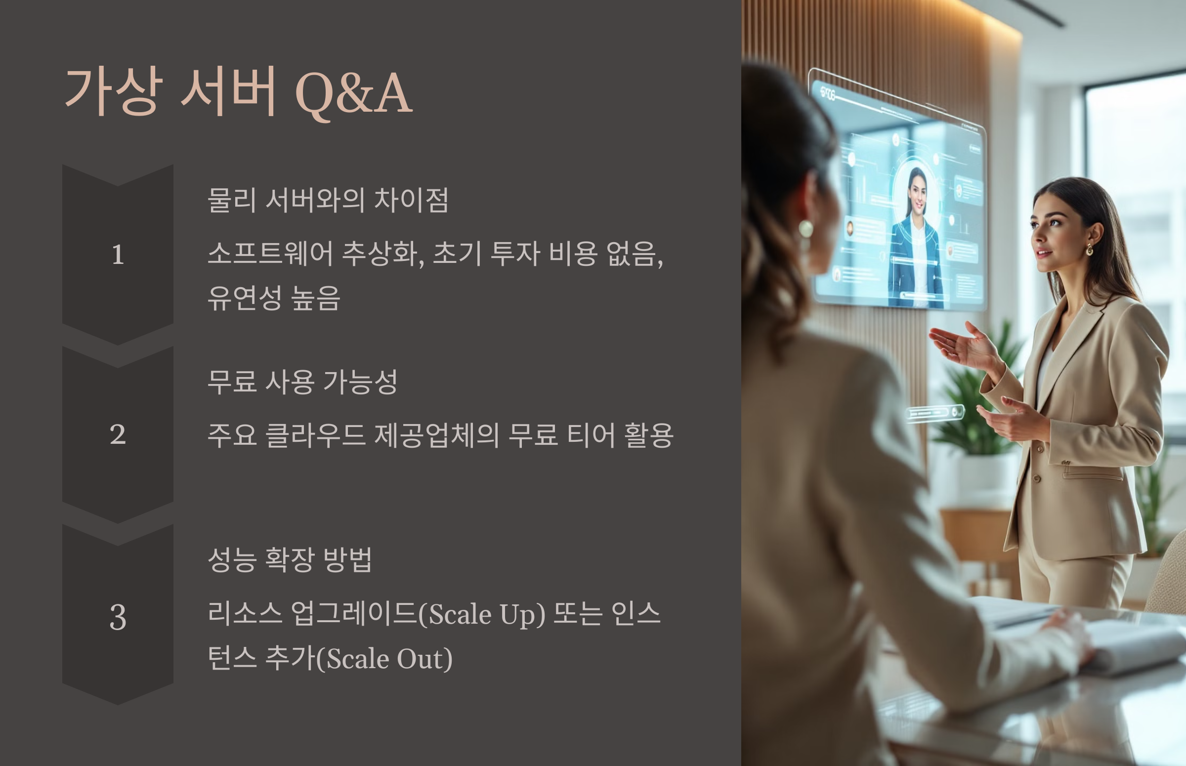 - 가상 서버는 물리 서버를 소프트웨어로 추상화한 것으로, 초기 투자 비용 없이 사용 가능하며, 유연성과 확장성이 뛰어납니다.