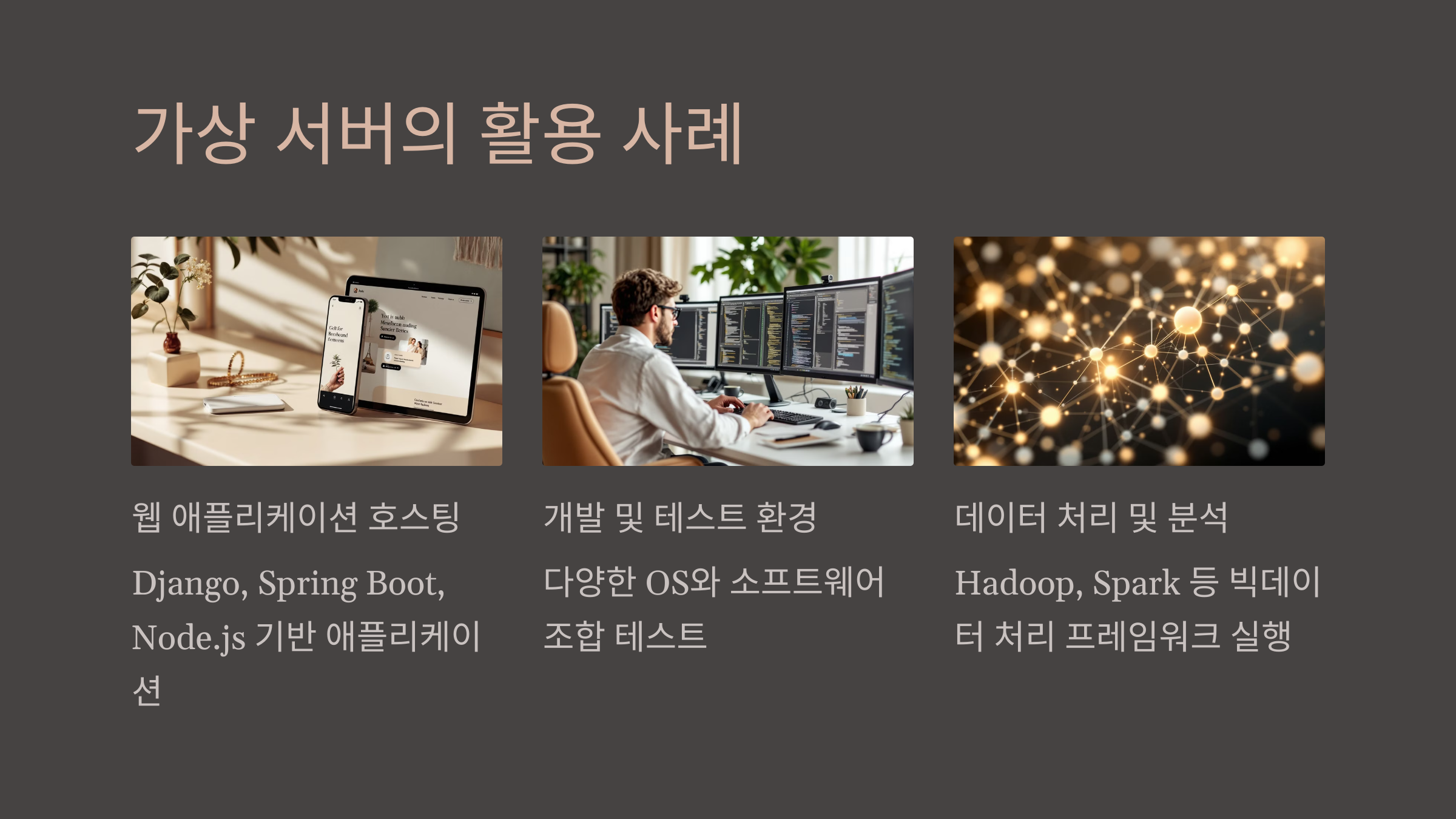 웹 애플리케이션 배포, 데이터 분석, 머신러닝, 테스트 환경 등 다양한 용도로 활용 가능한 가상 서버는 IT 인프라를 최적화하는 데 큰 도움이 됩니다.