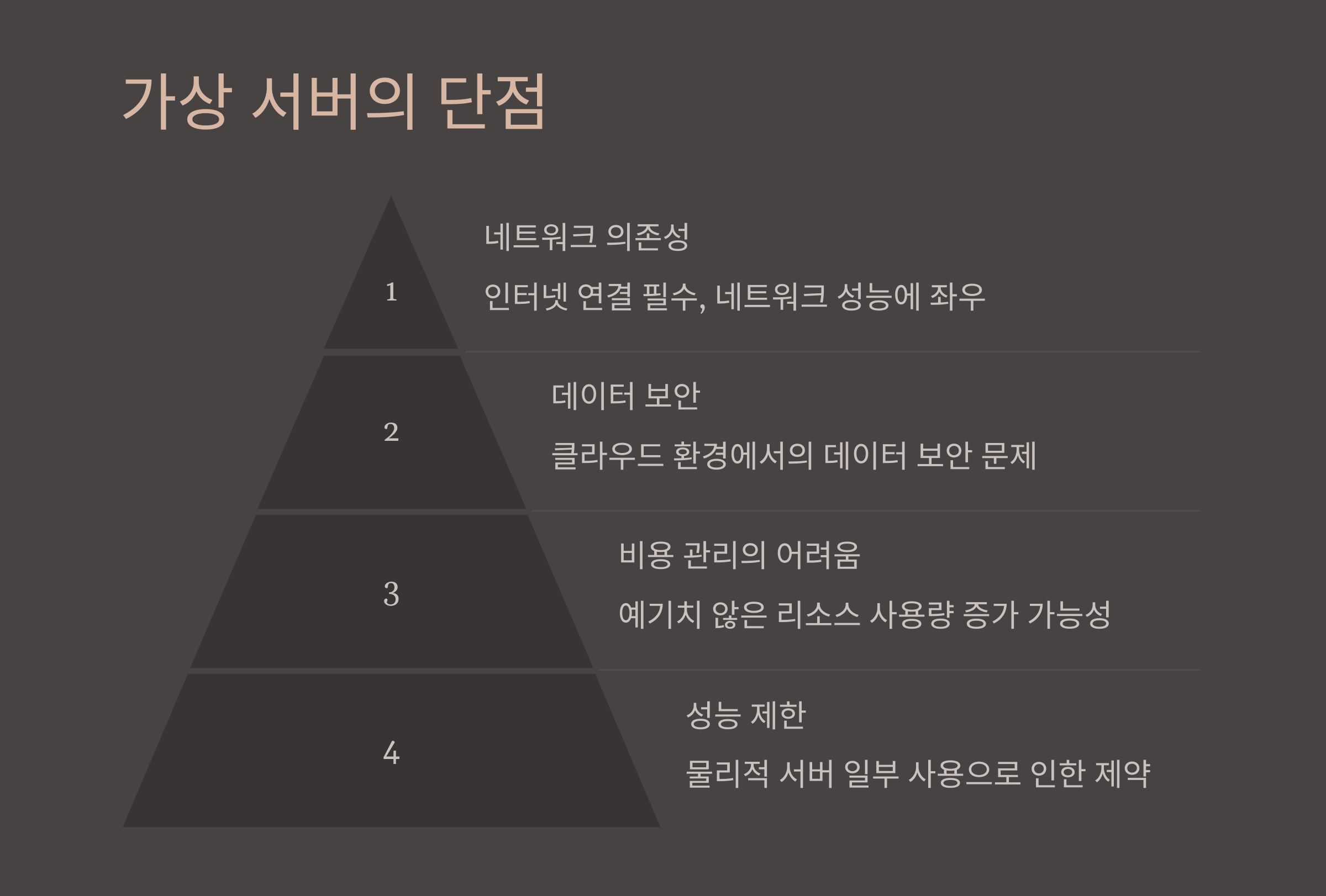 - 가상 서버는 인터넷 연결 없이 접근할 수 없으며, 네트워크 성능에 따라 서버의 성능이 좌우됩니다.
