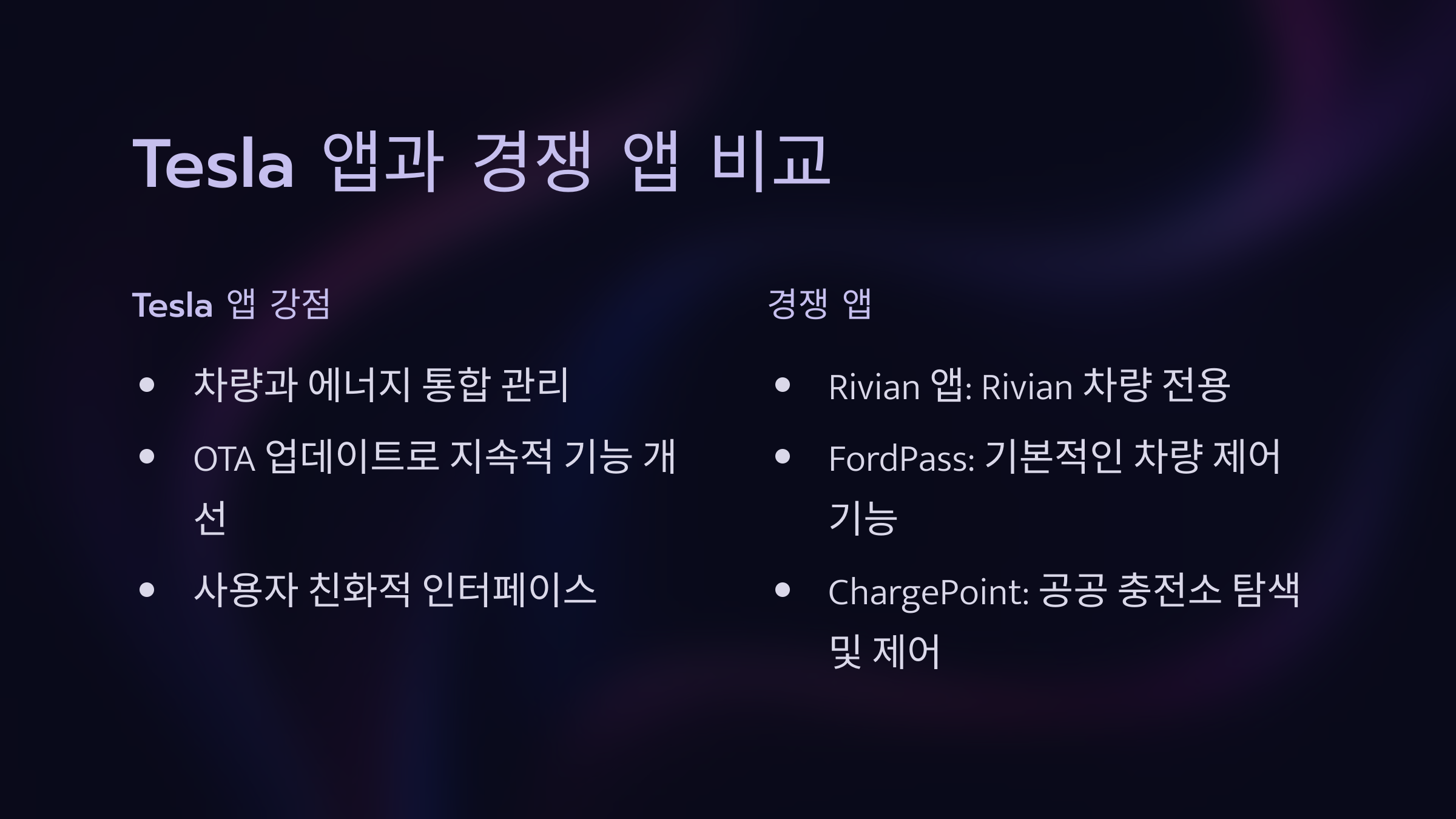 5️⃣ Tesla 앱과 경쟁 앱 비교