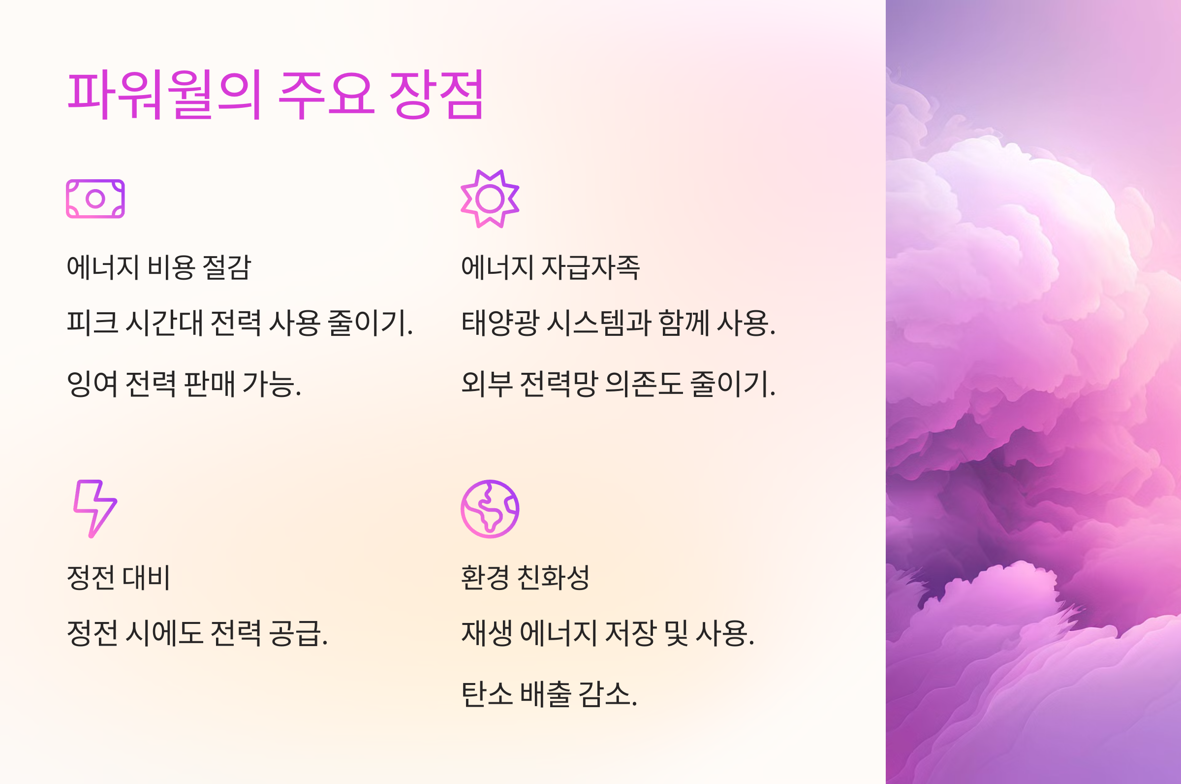 정전 대비, 에너지 비용 절감, 환경 보호라는 실질적인 혜택을 제공하며, 전기 사용 방식에 혁신을 가져왔습니다.
