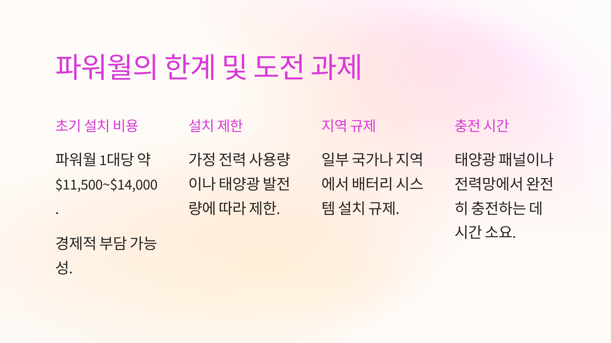 - 초기 구매 비용(파워월 1대당 약 $11,500~$14,000)이 높아 경제적 부담이 클 수 있음.
