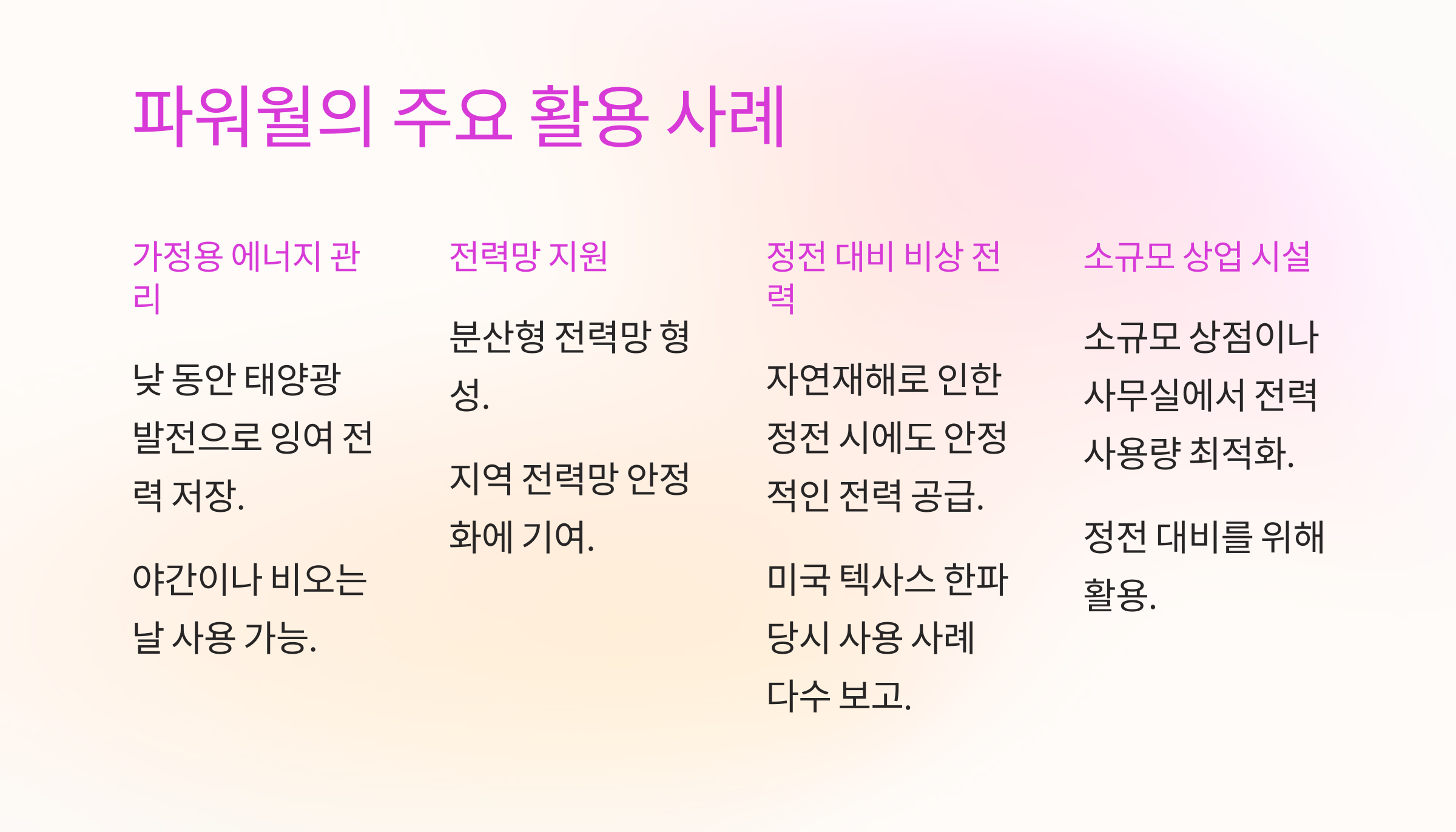 - 예시: 미국 텍사스 한파 당시 파워월 사용 사례 다수 보고.