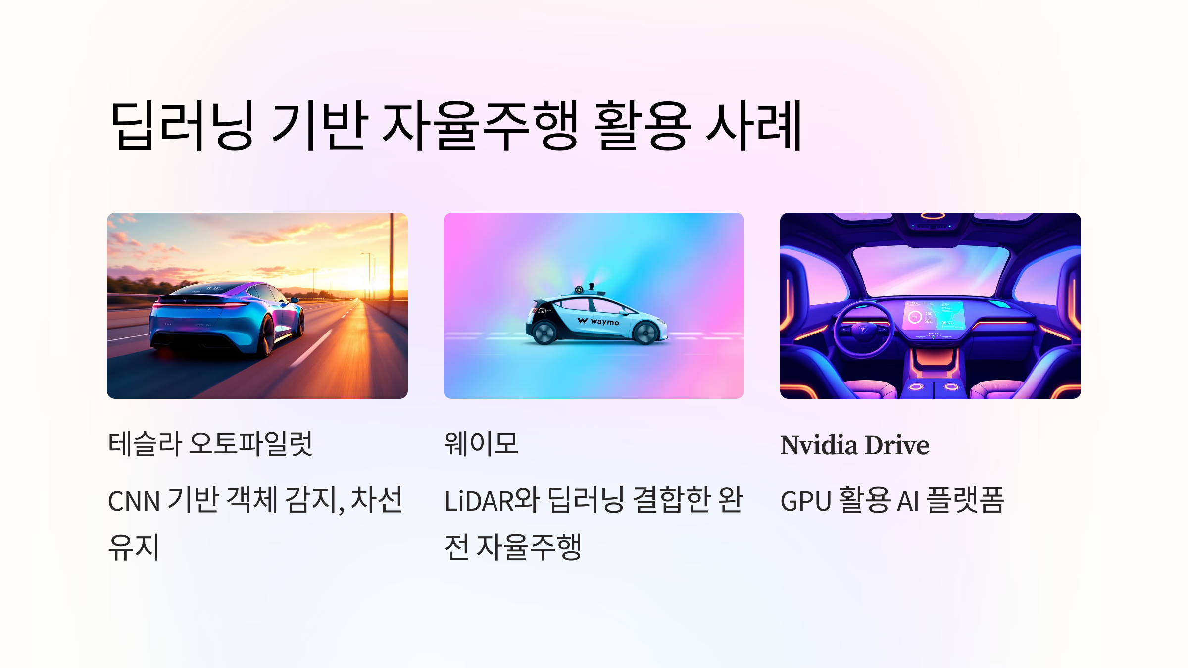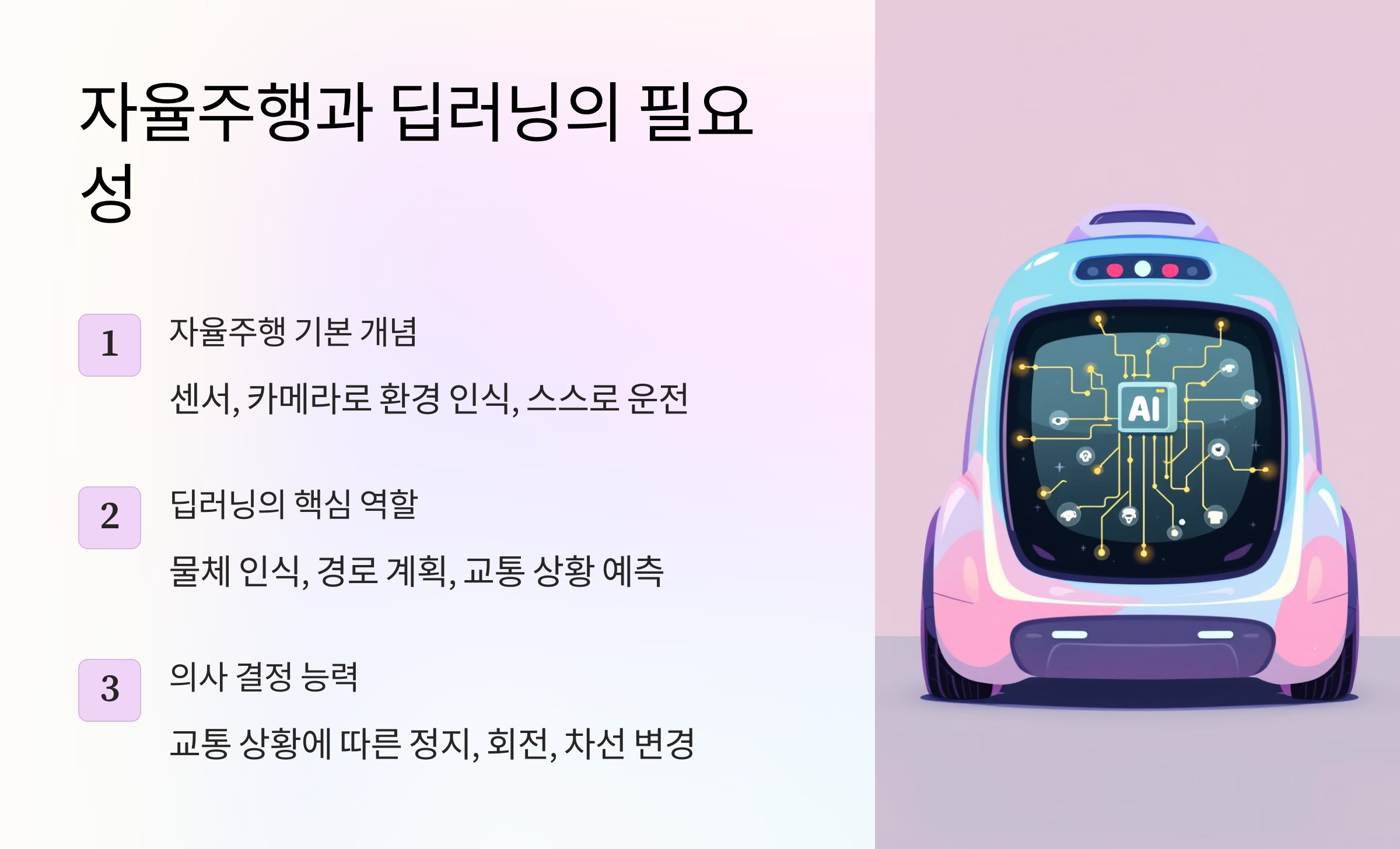 - 딥러닝은 객체 인식, 경로 계획, 의사 결정 등 자율주행의 핵심 기능을 구현하며, 복잡한 도로 환경에서도 높은 정확도를 제공합니다.