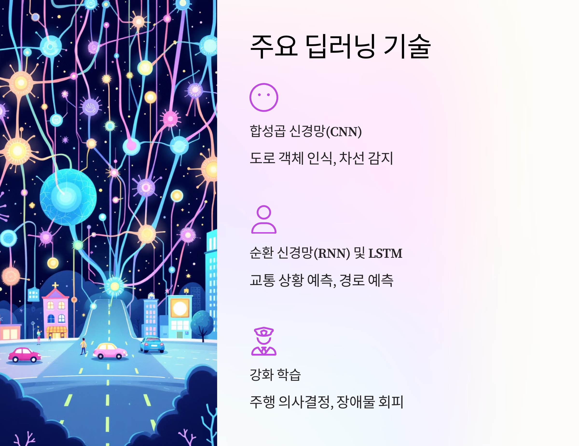 - 컴퓨터 비전(CV): 카메라를 사용해 도로 표지판, 신호등, 보행자를 인식(CNN 활용).