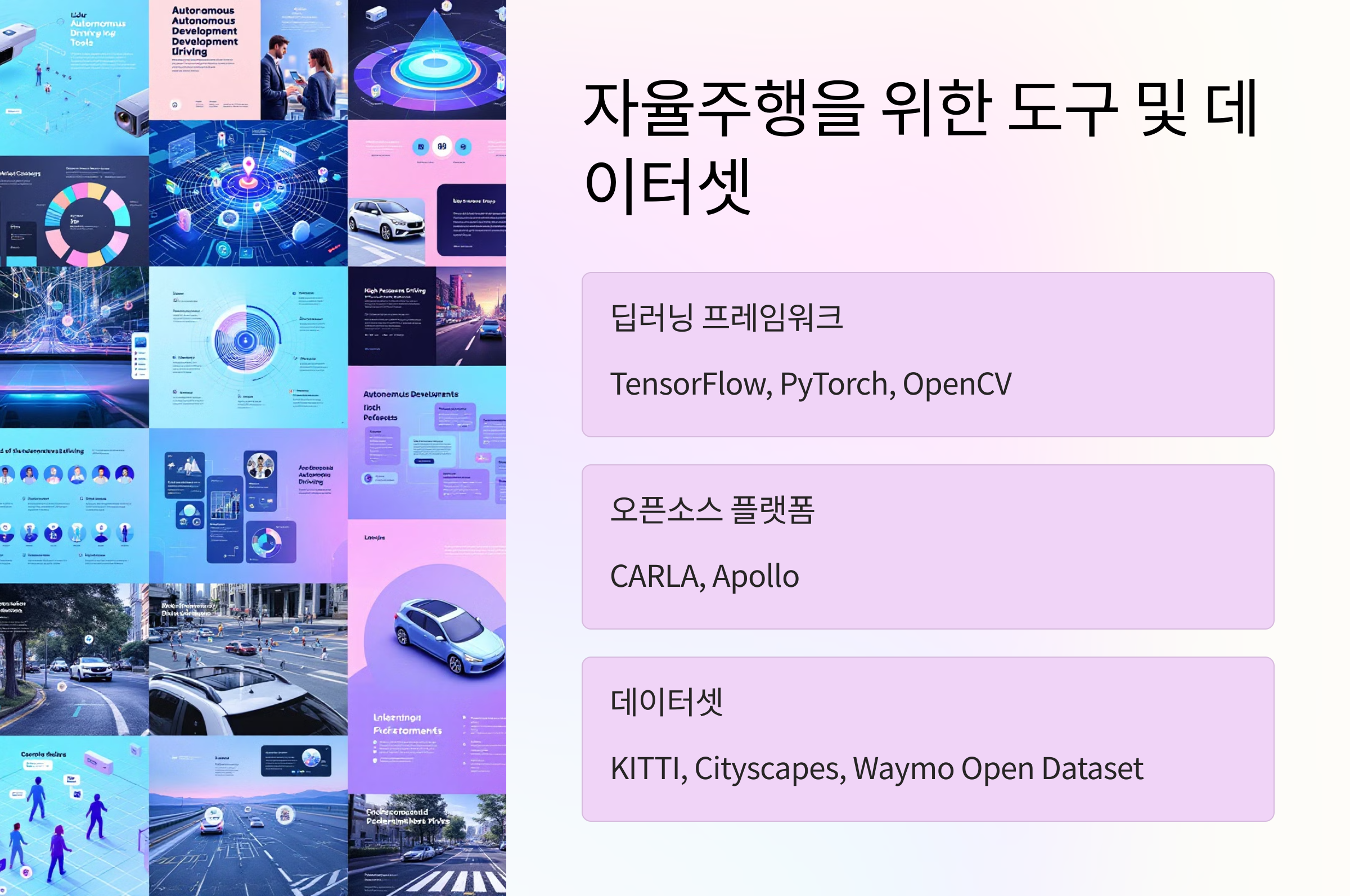 자율주행 기술에 관심이 있다면 딥러닝 프레임워크(TensorFlow, PyTorch)와 오픈소스 시뮬레이터(CARLA)를 활용하여 객체 인식, 경로 계획 등의 기술을 직접 실습해보세요. AI가 그리는 미래의 도로에서 여러분도 함께해보세요 🚀