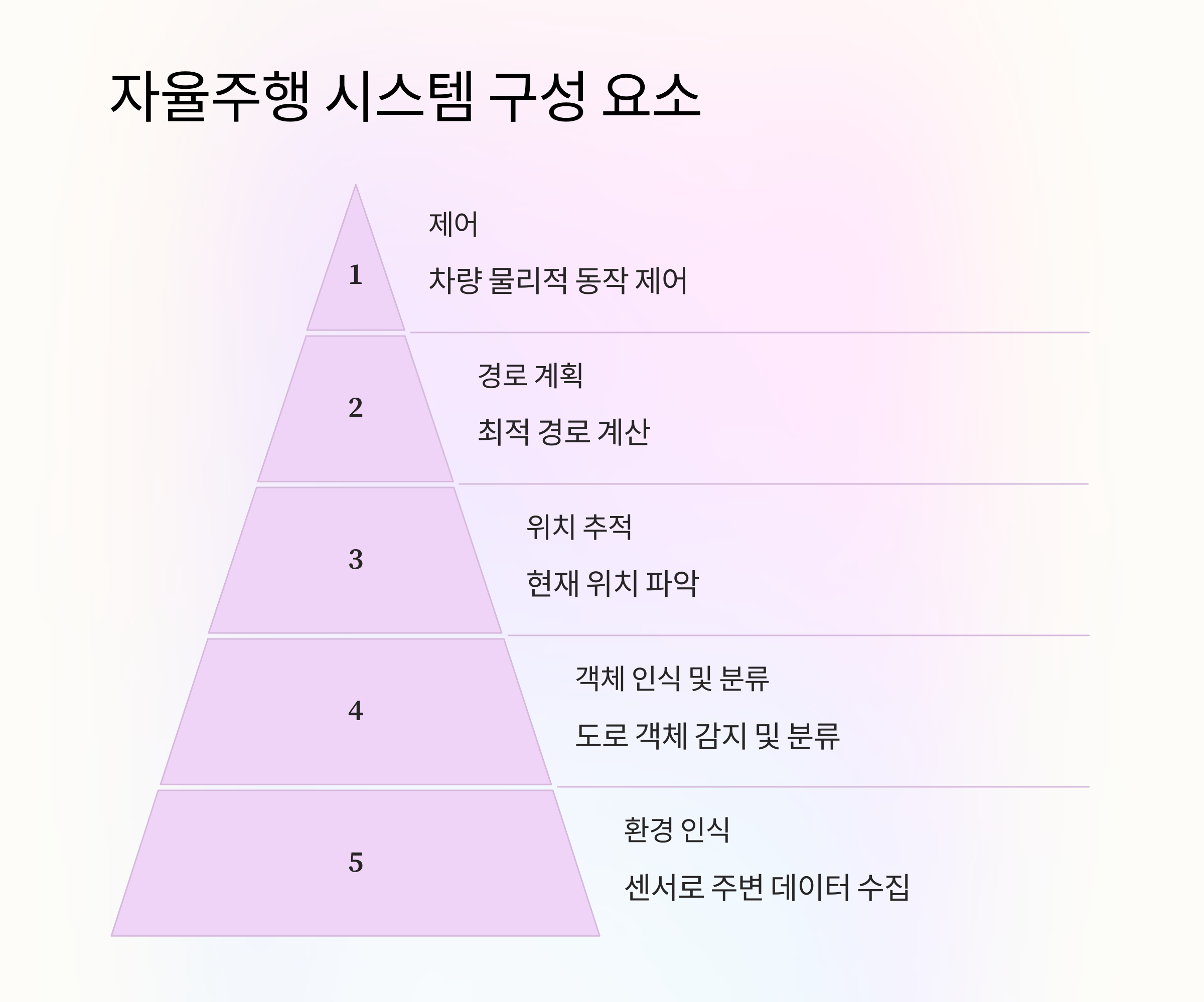 - 완전 자율주행(Level 5): 인간 개입 없이 차량이 스스로 모든 주행 작업 수행.