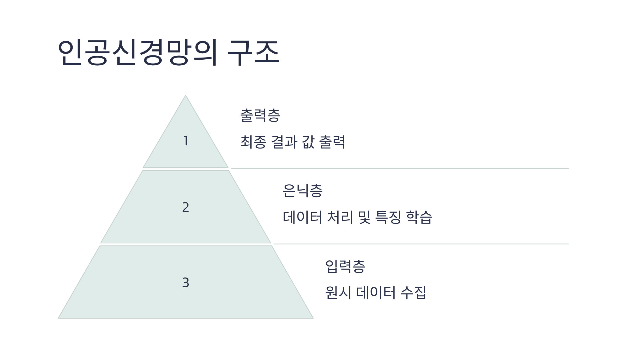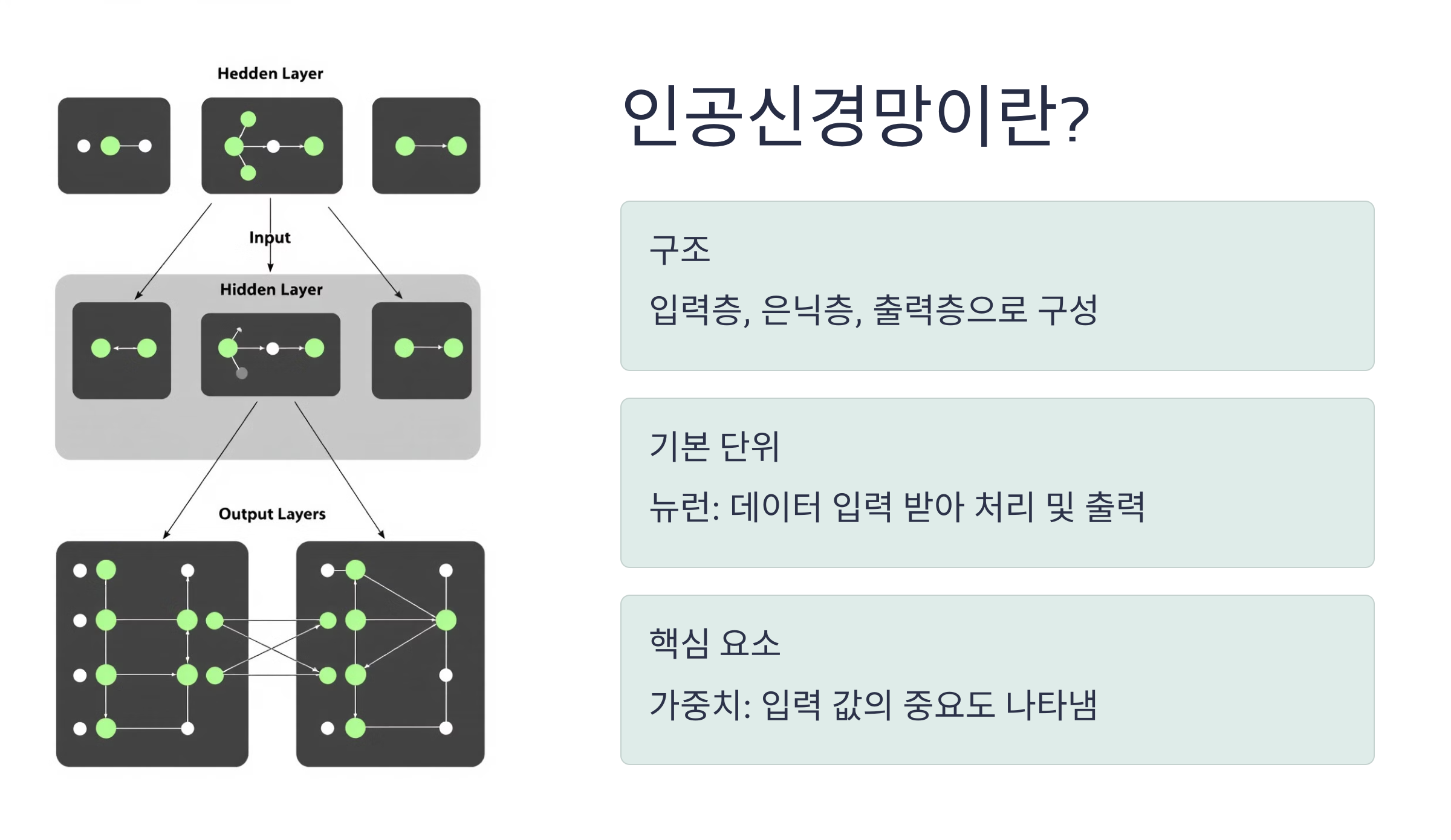 - 레이어(Layer): 신경망을 구성하는 층으로, 입력층, 은닉층, 출력층으로 나뉨.