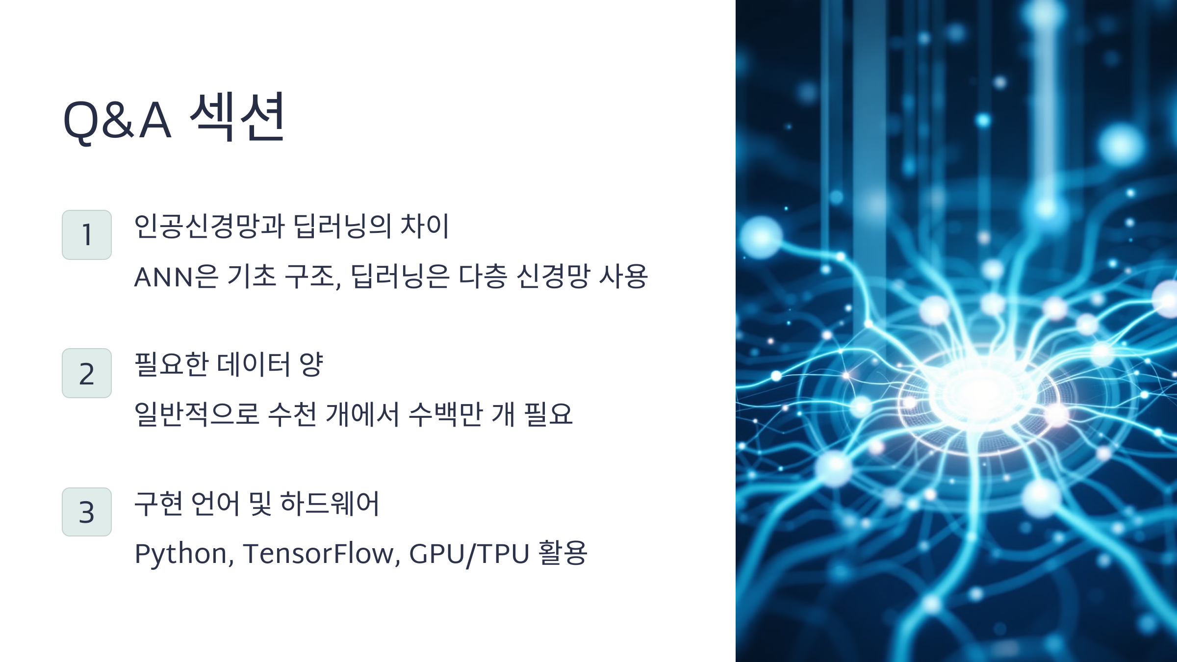 오늘날 ANN은 이미지 인식, 음성 처리, 자연어 처리 등 다양한 분야에서 활용되며, 앞으로도 더욱 중요한 역할을 할 것입니다.