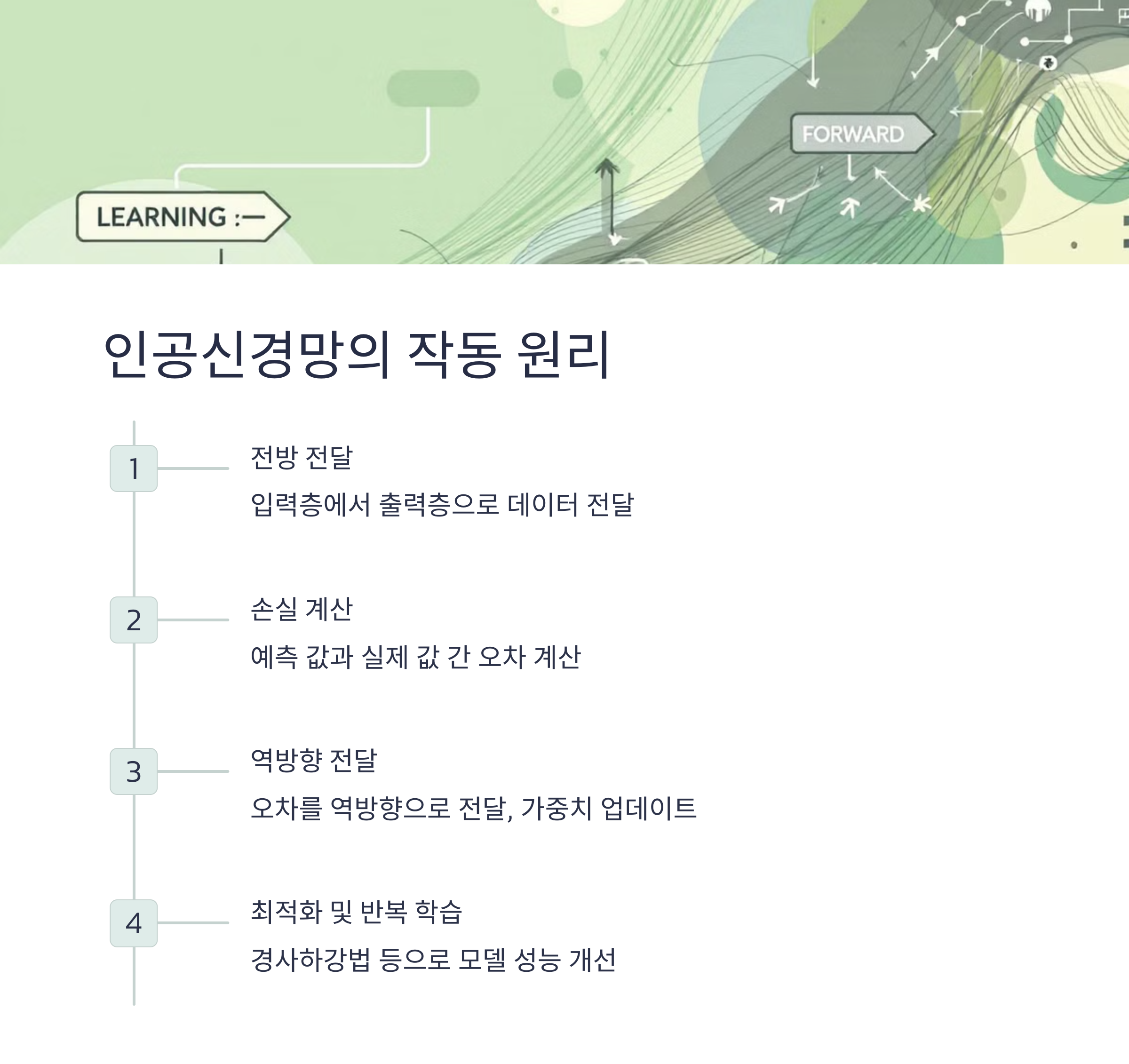 인공신경망은 다음 단계를 거쳐 데이터를 처리하고 학습합니다.