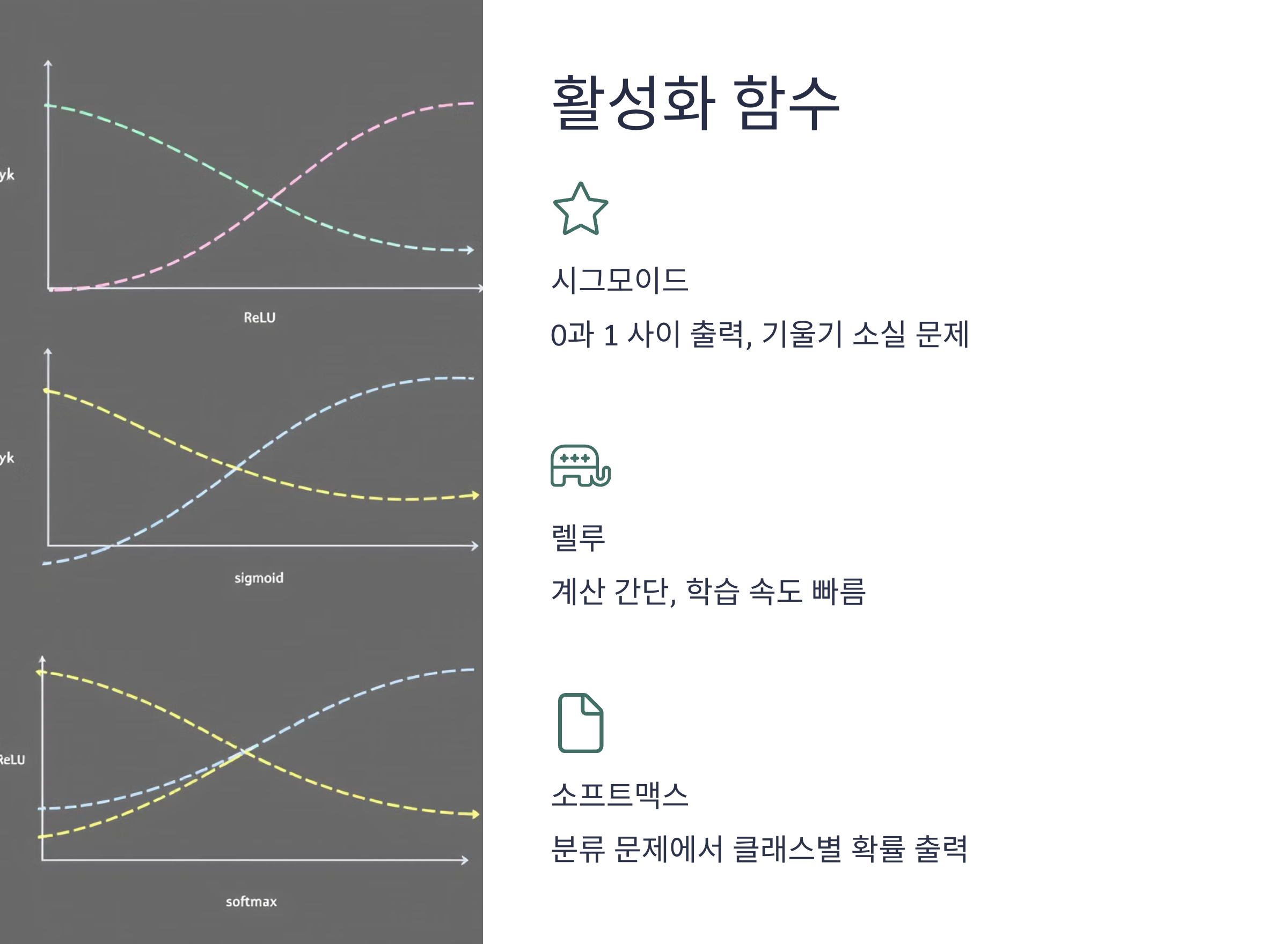 - 활성화 함수(Activation Function): 뉴런의 출력 값을 결정하며, 비선형성을 부여해 복잡한 문제를 해결 가능.
