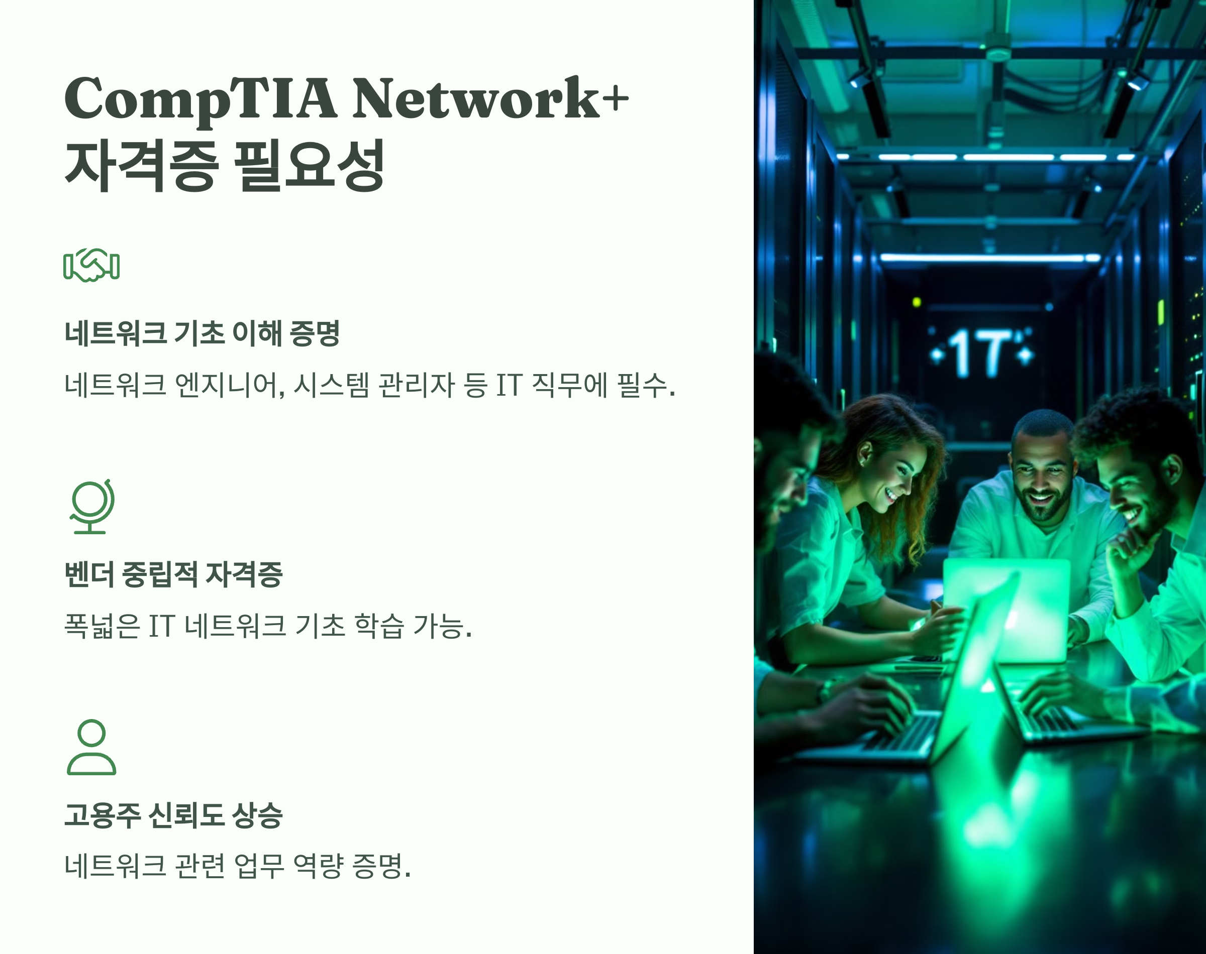 - 네트워크 기초 이해 증명: 네트워크 기본 개념과 실무 기술을 검증하며, 네트워크 엔지니어, 시스템 관리자 등 다양한 IT 직무에서 요구됩니다.