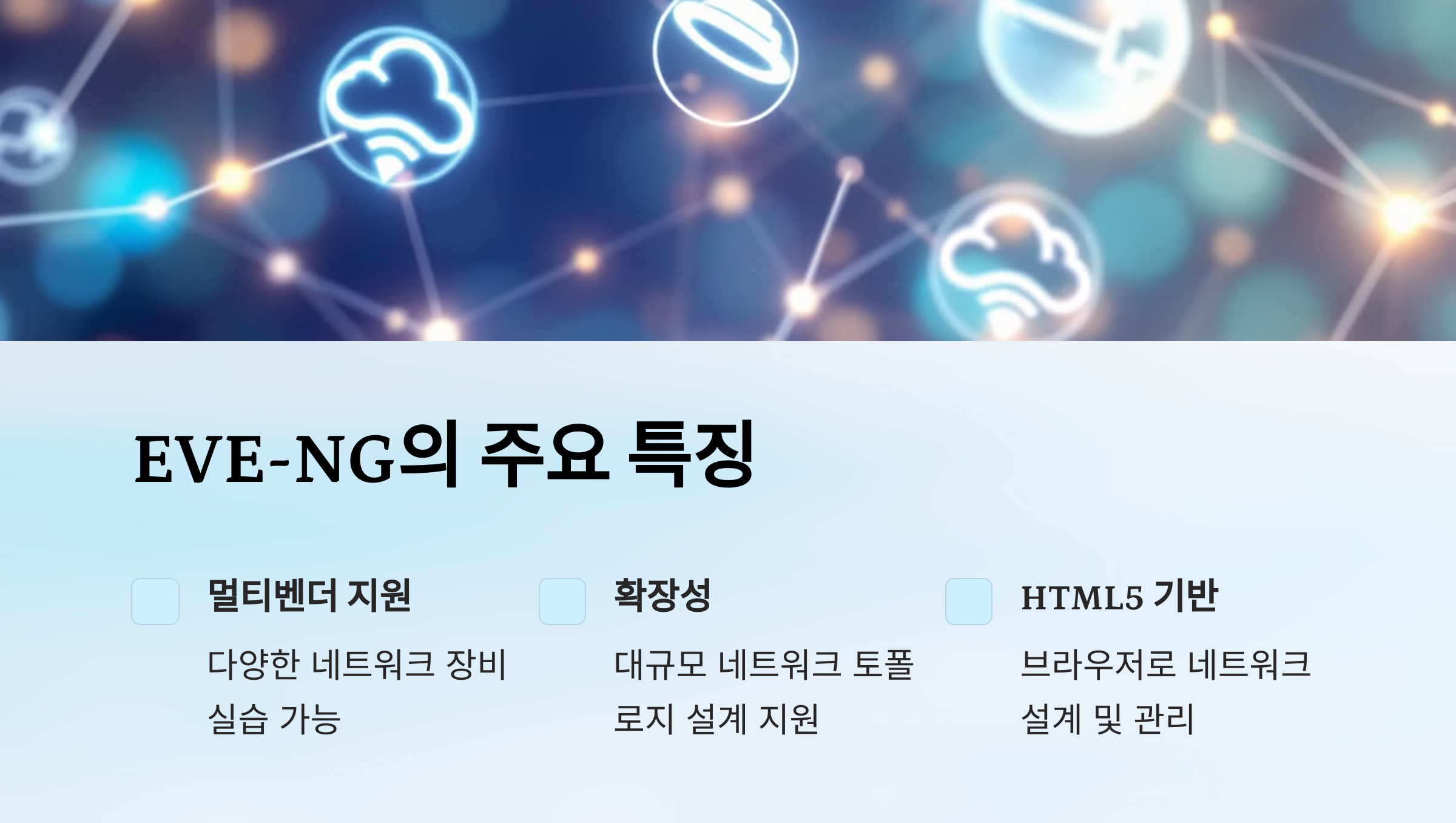 A3. EVE-NG는 HTML5 기반 인터페이스로 별도의 클라이언트 없이 작동하며, 멀티벤더 및 다중 사용자 환경에 최적화되어 있습니다.