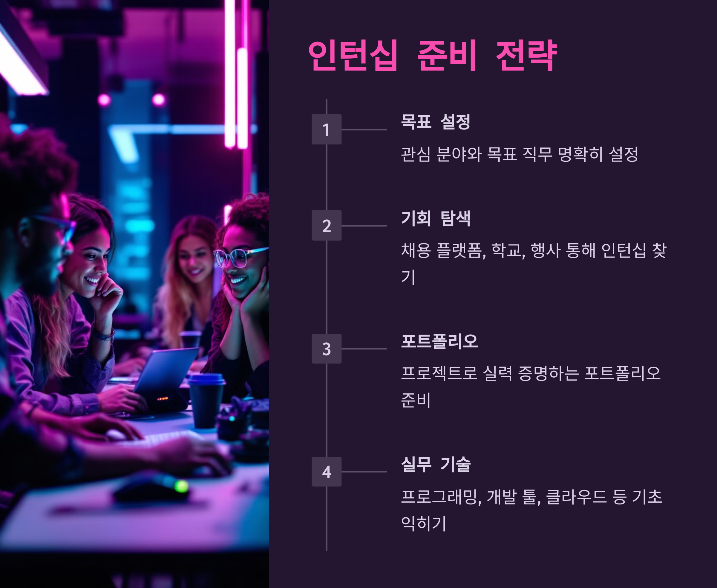 - 팁: 관심 분야에 따라 기업이 제공하는 인턴십 프로그램의 내용과 방향성을 검토하고, 해당 직무에서 필요한 기초 기술을 익혀보세요.