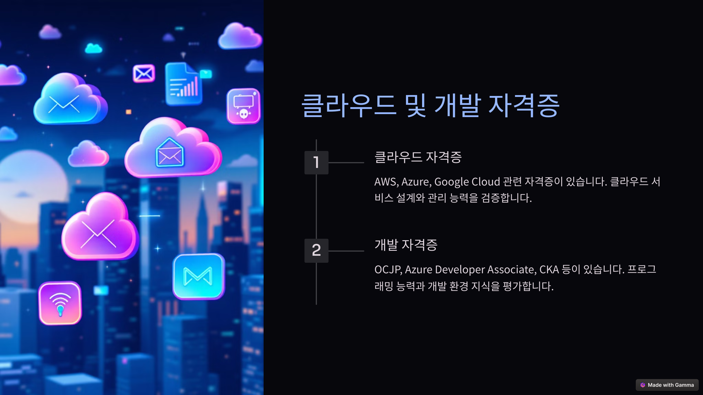 - AWS Certified Solutions Architect – Associate: 아마존 웹 서비스(AWS)의 기본적인 클라우드 서비스 설계와 관리 능력을 인증하는 자격증입니다.
