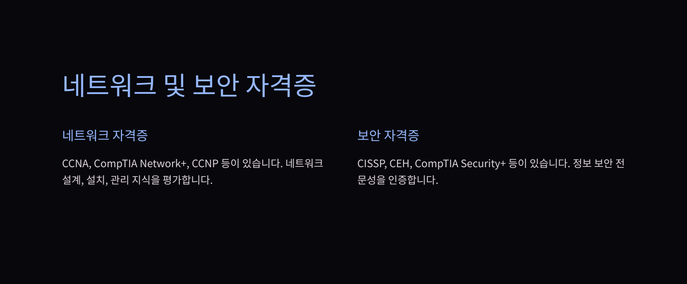 - CCNP (Cisco Certified Network Professional): 고급 네트워크 엔지니어로 성장하기 위한 심화 과정으로 네트워크 설계 및 문제 해결 능력을 다룹니다.