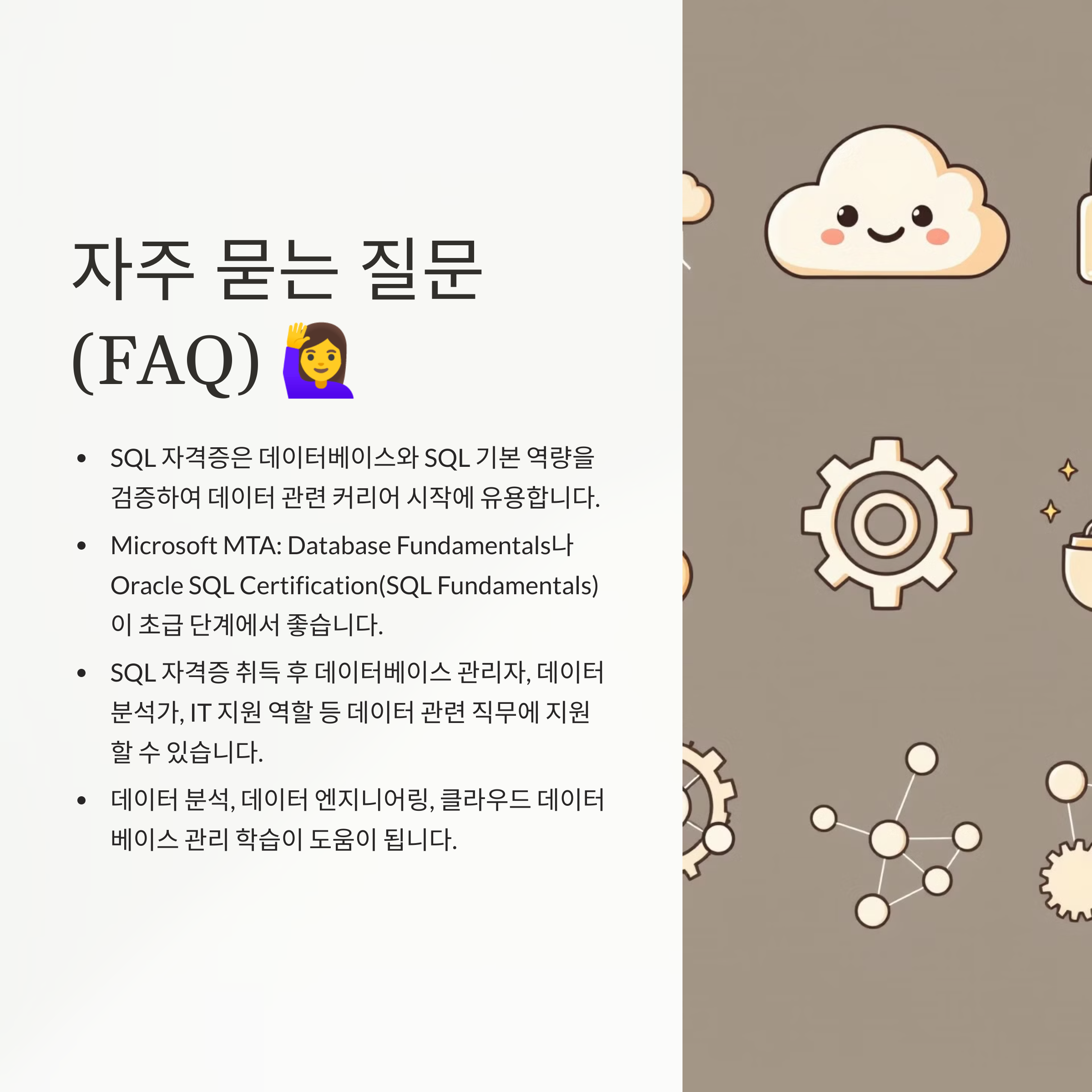 A1. SQL 자격증은 데이터베이스와 SQL 기본 역량을 검증하며, 데이터 관련 커리어 시작에 유용합니다.