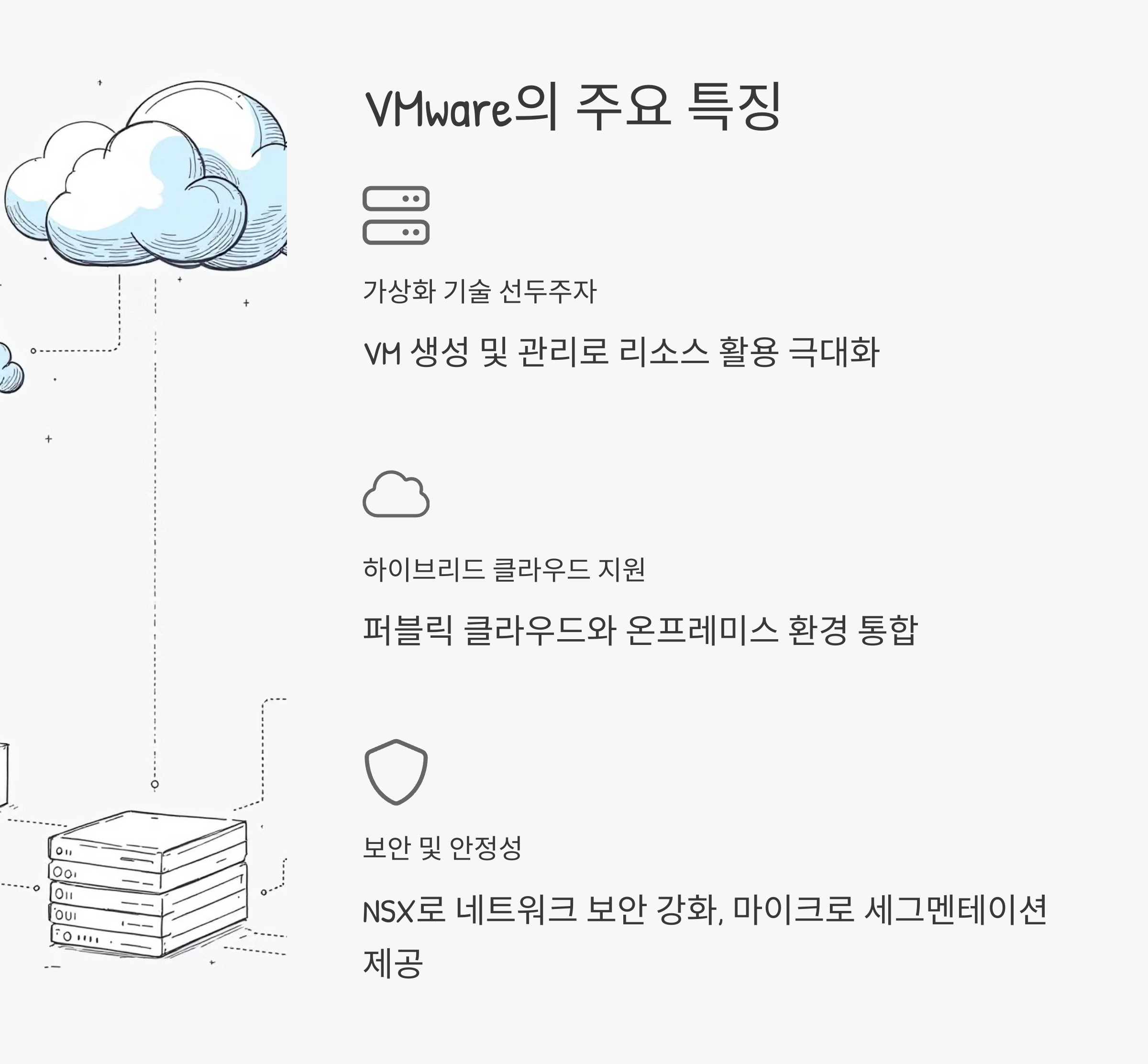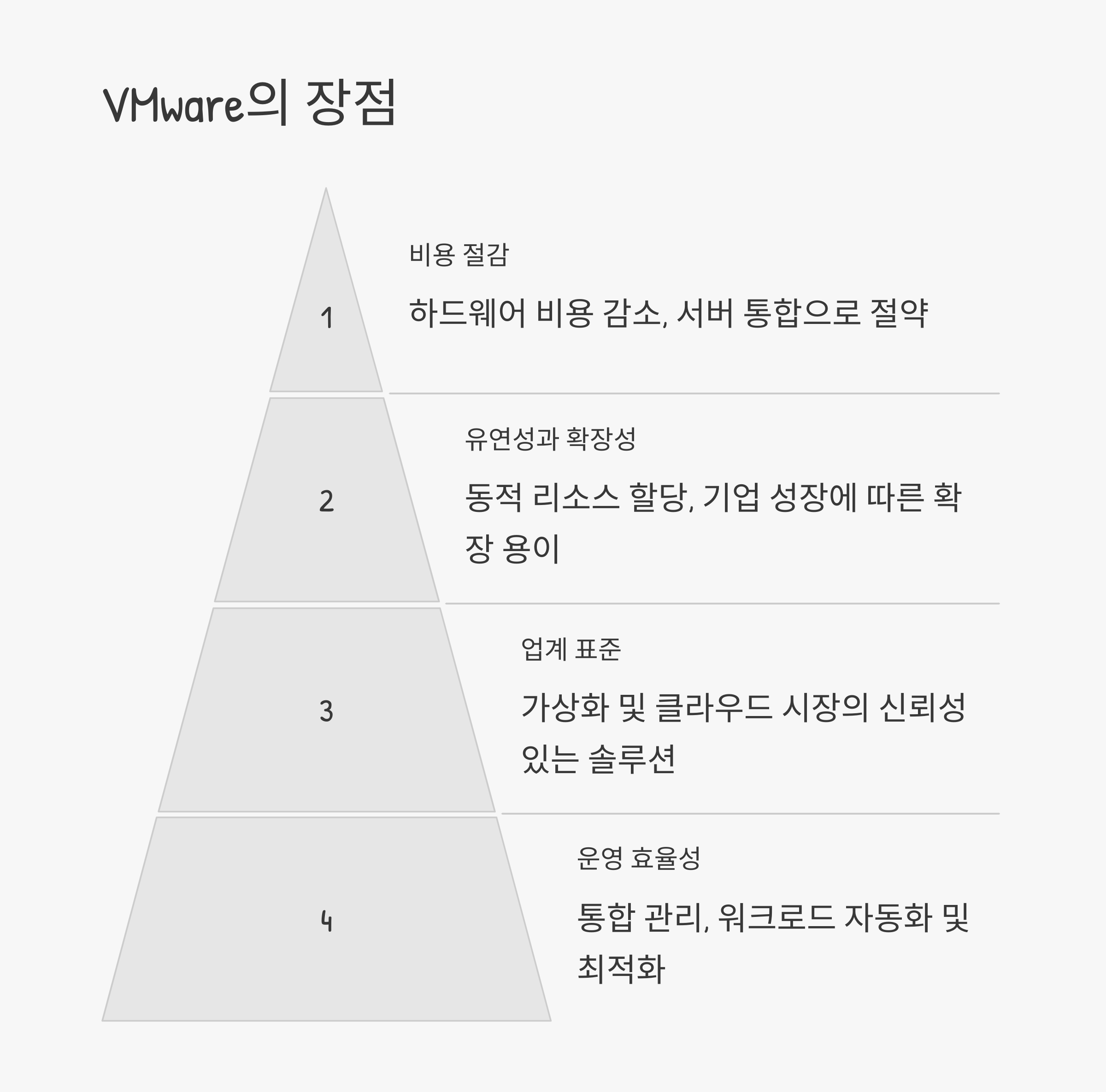 - VMware는 가상화 및 클라우드 시장에서 표준으로 인정받아, 기술 도입의 신뢰성 보장.