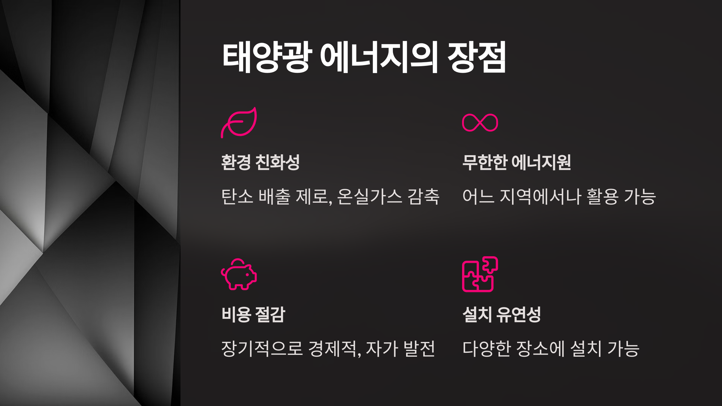 - 태양은 지구에서 사용할 수 있는 에너지 자원이 무한하며, 어느 지역에서나 활용 가능.