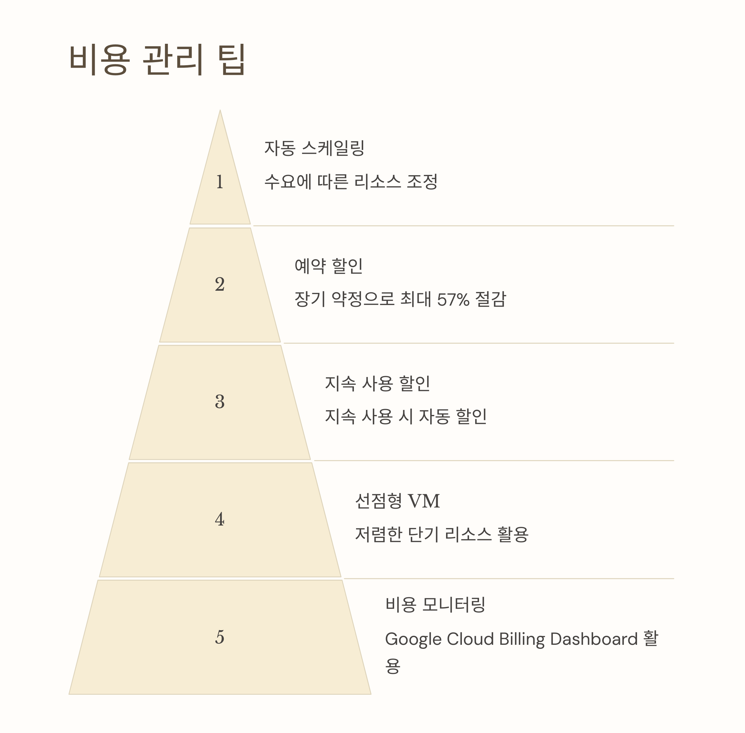 - 비용 효율성: 지속 사용 할인(Sustained Use Discount), 예약 할인(Committed Use Discount) 제공.