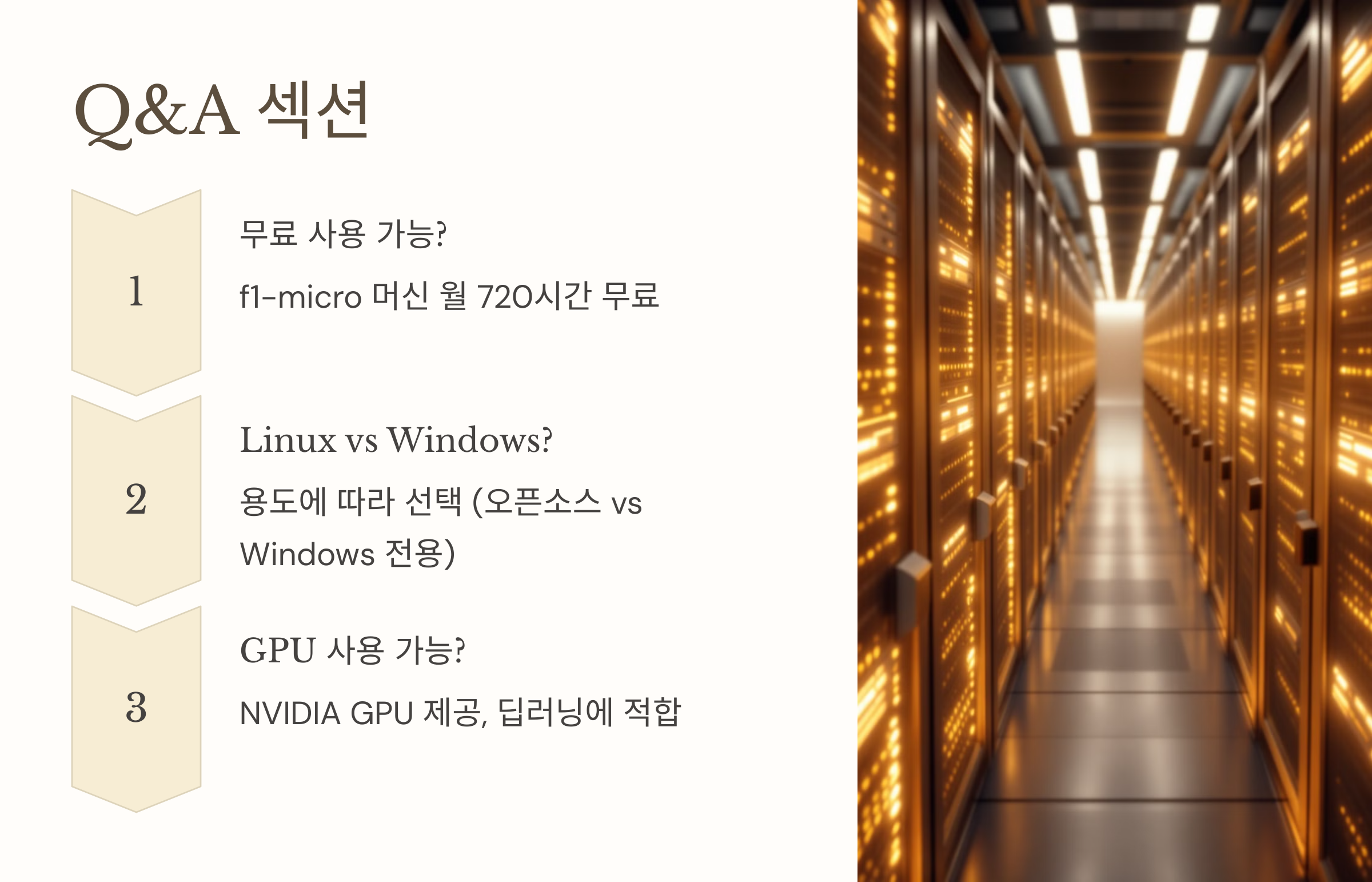 사용자는 원하는 운영체제와 하드웨어 사양을 선택하여 애플리케이션 실행, 데이터 처리, 머신러닝 학습 등 다양한 작업을 수행할 수 있습니다.