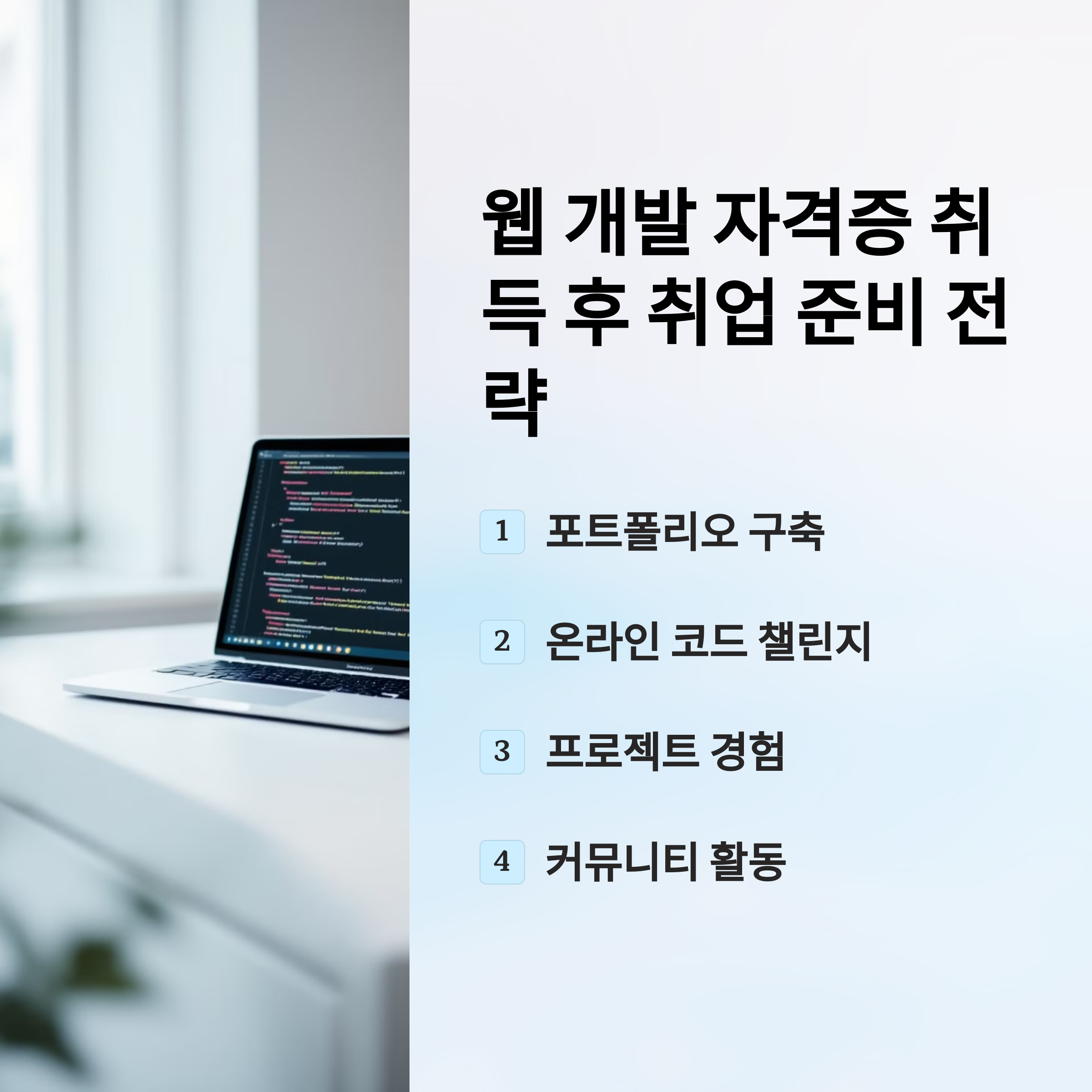 웹 개발 자격증 취득 후에는 이를 바탕으로 웹 개발 분야에서 실질적인 취업 기회를 늘릴 수 있는 전략을 세우는 것이 중요합니다. 자격증만으로는 충분하지 않기 때문에, 실무 역량을 입증하고 지원 경쟁력을 강화하는 데 집중해야 합니다.