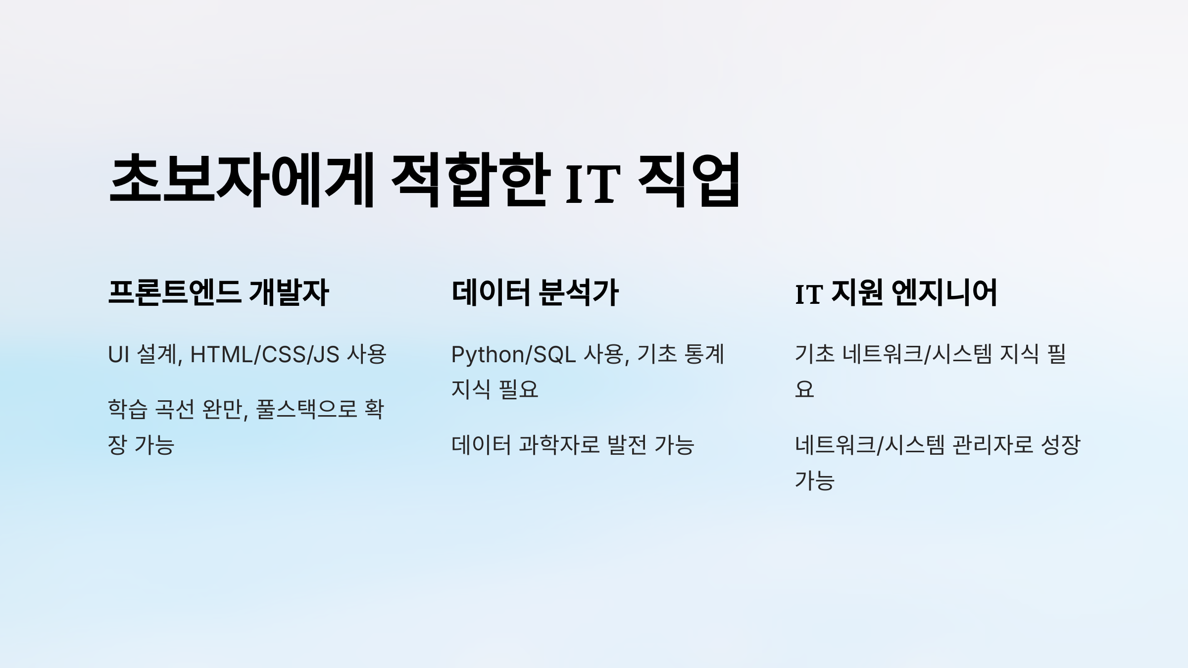 프론트엔드 개발자, 데이터 분석가, IT 지원 엔지니어는 비교적 진입 장벽이 낮고, 초보자에게 적합한 직무로 꼽힙니다.