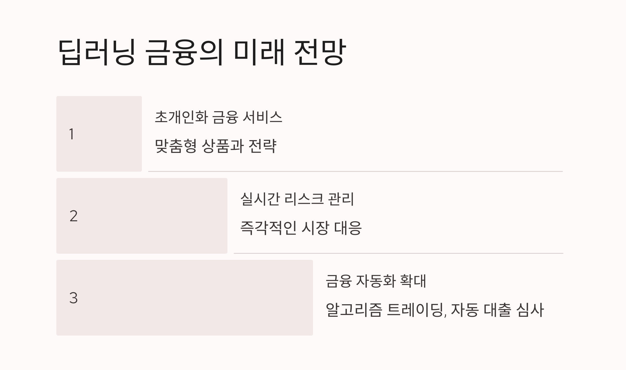 - 금융 자동화 확대: 알고리즘 트레이딩과 자동화된 대출 심사.