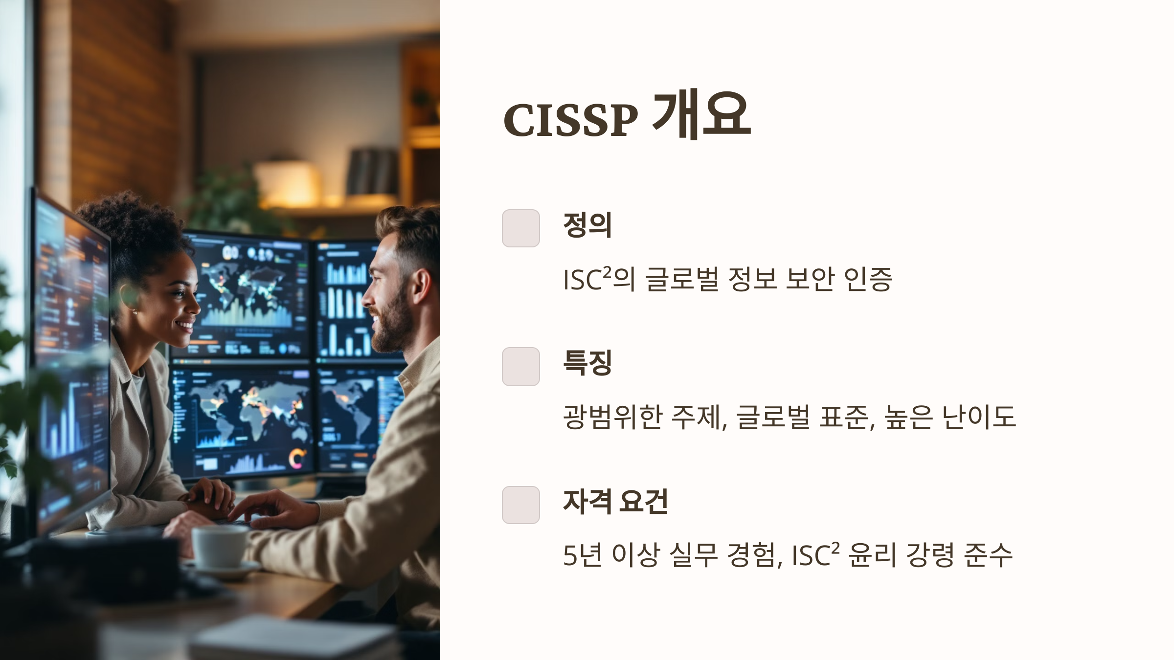 CISSP는 ISC²가 제공하는 정보 보안 분야의 글로벌 인증으로, 보안 정책 수립, 설계, 운영, 관리 등 다양한 보안 주제를 다룹니다.