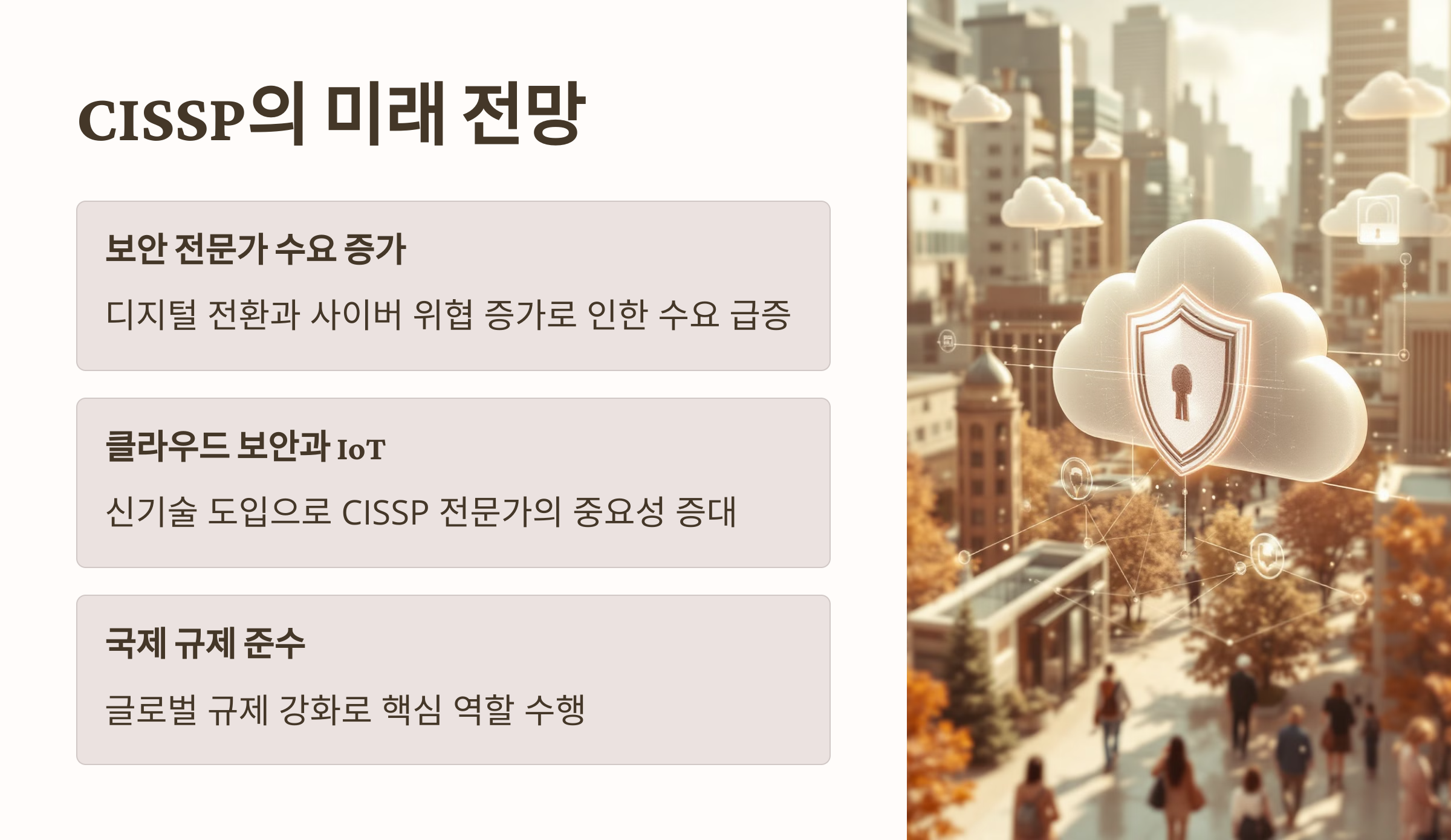 - 클라우드, IoT 보안과 같은 신기술 도입으로 CISSP 전문가의 중요성이 더욱 커질 전망.