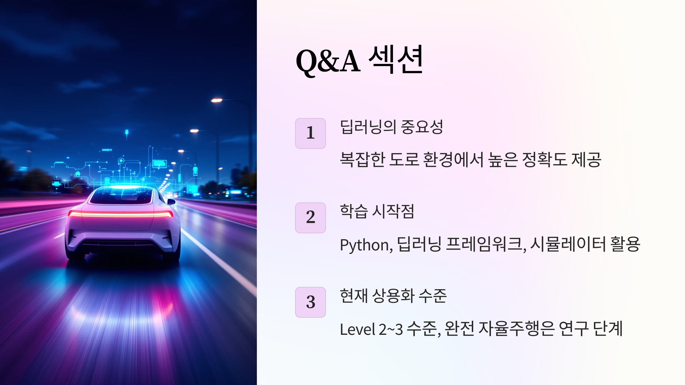 - 딥러닝은 객체 인식, 경로 계획, 의사 결정 등 자율주행의 핵심 기능을 구현하며, 복잡한 도로 환경에서도 높은 정확도를 제공합니다.