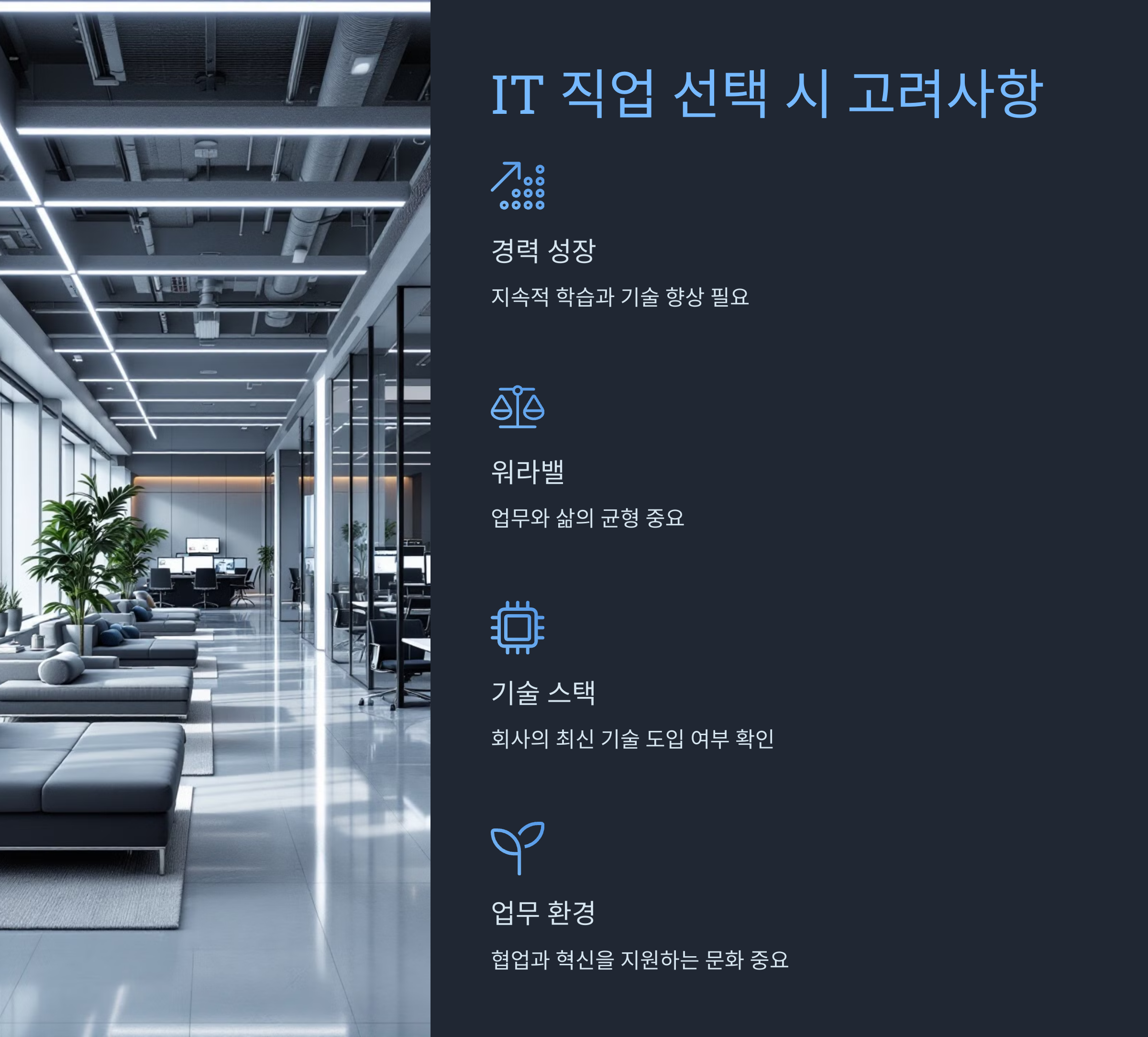 커리어 성장 가능성, 워라밸, 회사의 기술 스택, 업무 환경 등도 IT 직업 선택에 있어 중요한 요소입니다.
