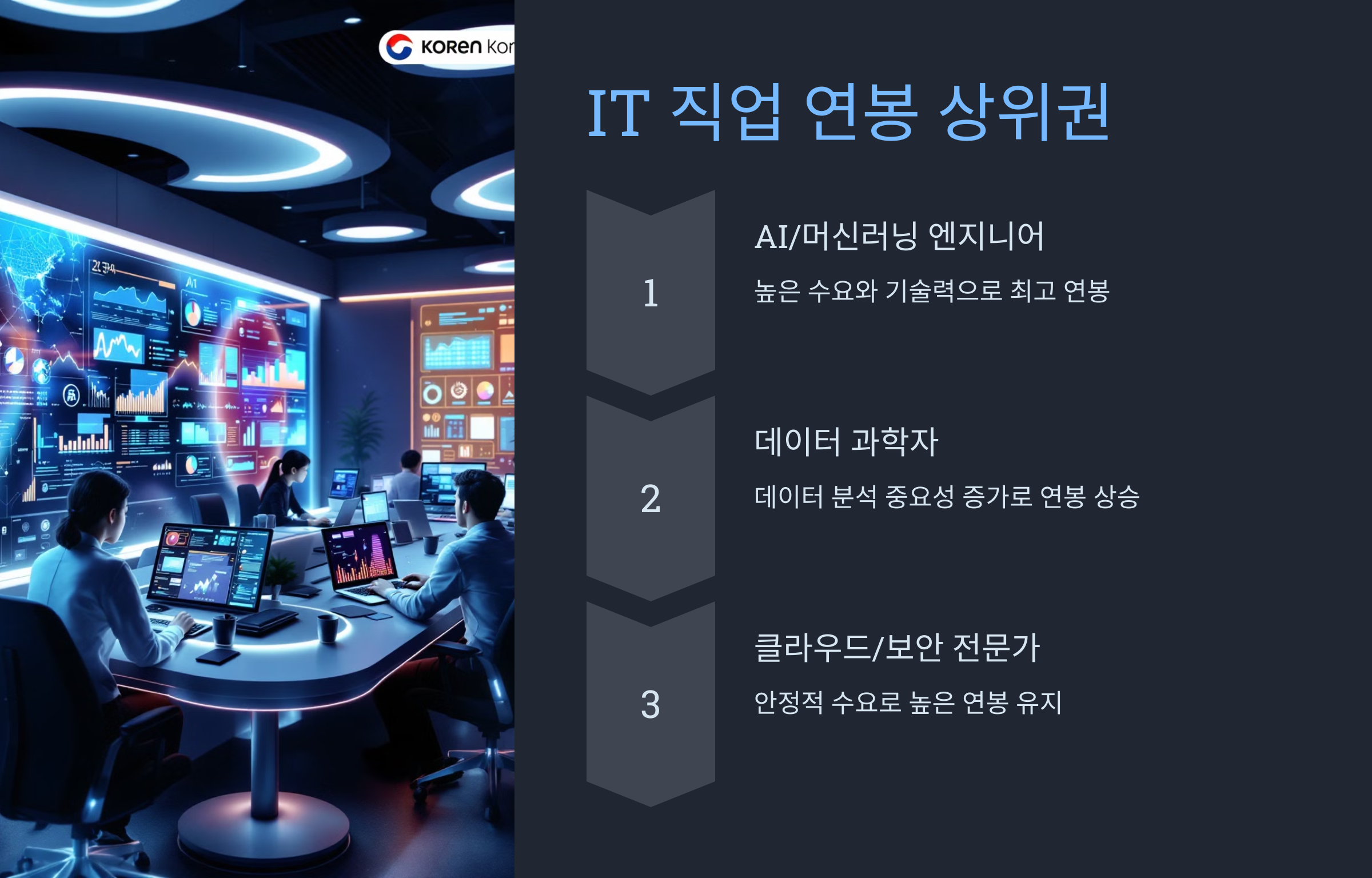 2024년 한국 IT 직업군 중에서 AI/머신러닝 엔지니어와 데이터 과학자가 비교적 높은 연봉을 받는 직종으로 꼽힙니다. 특히 AI와 데이터 분석 기술이 더욱 중요해질 전망이므로, 이 두 직종의 연봉은 앞으로도 높아질 가능성이 큽니다. 또한 클라우드와 사이버 보안 직종도 수요가 계속 증가하면서 안정적으로 높은 연봉을 유지할 것으로 보입니다.