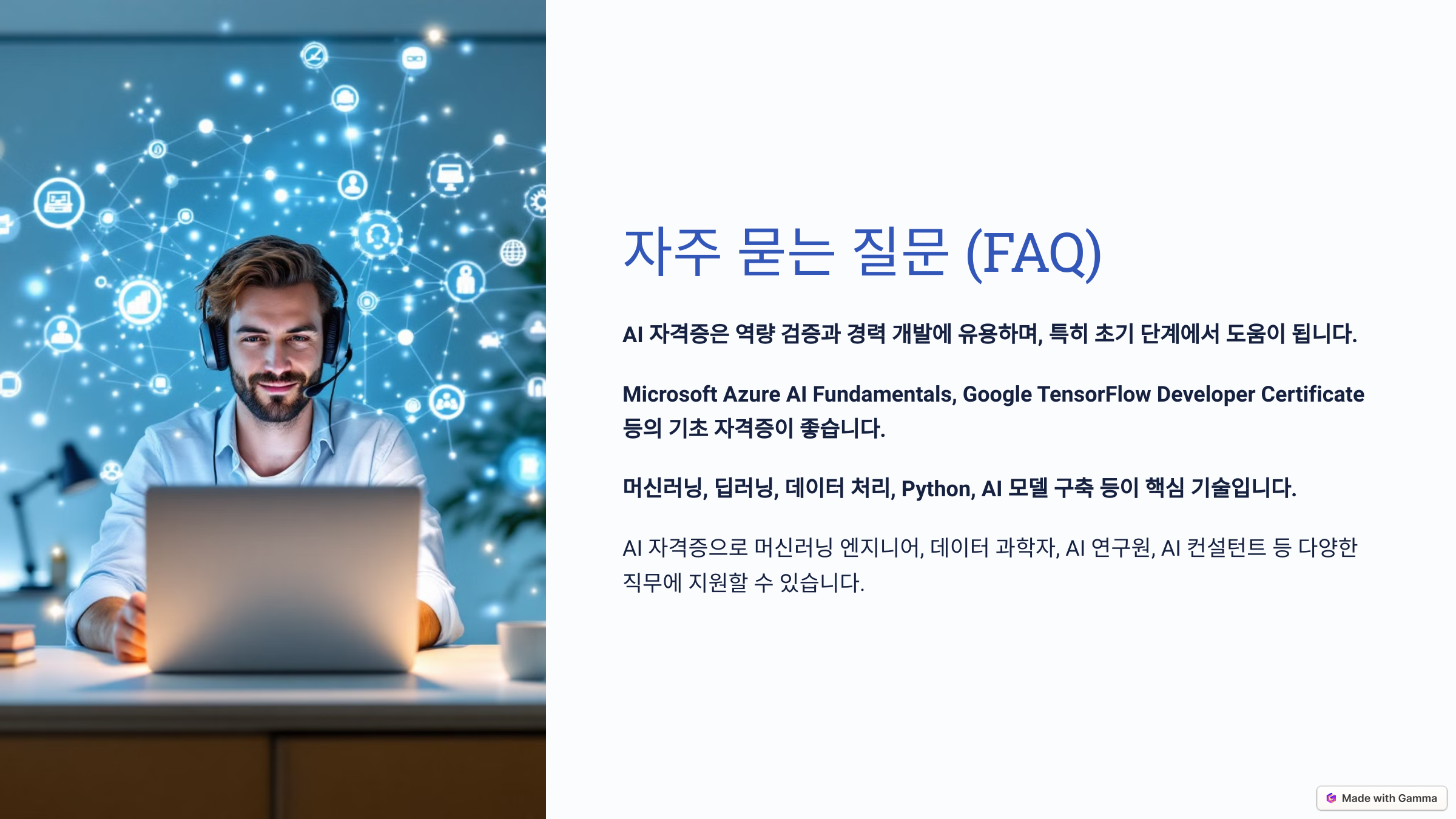 A1. AI 자격증은 AI와 머신러닝 역량을 검증하는 좋은 방법으로, 특히 신입이나 경력 초기 단계에서 유용합니다. 경력 개발과 취업에 도움이 됩니다.