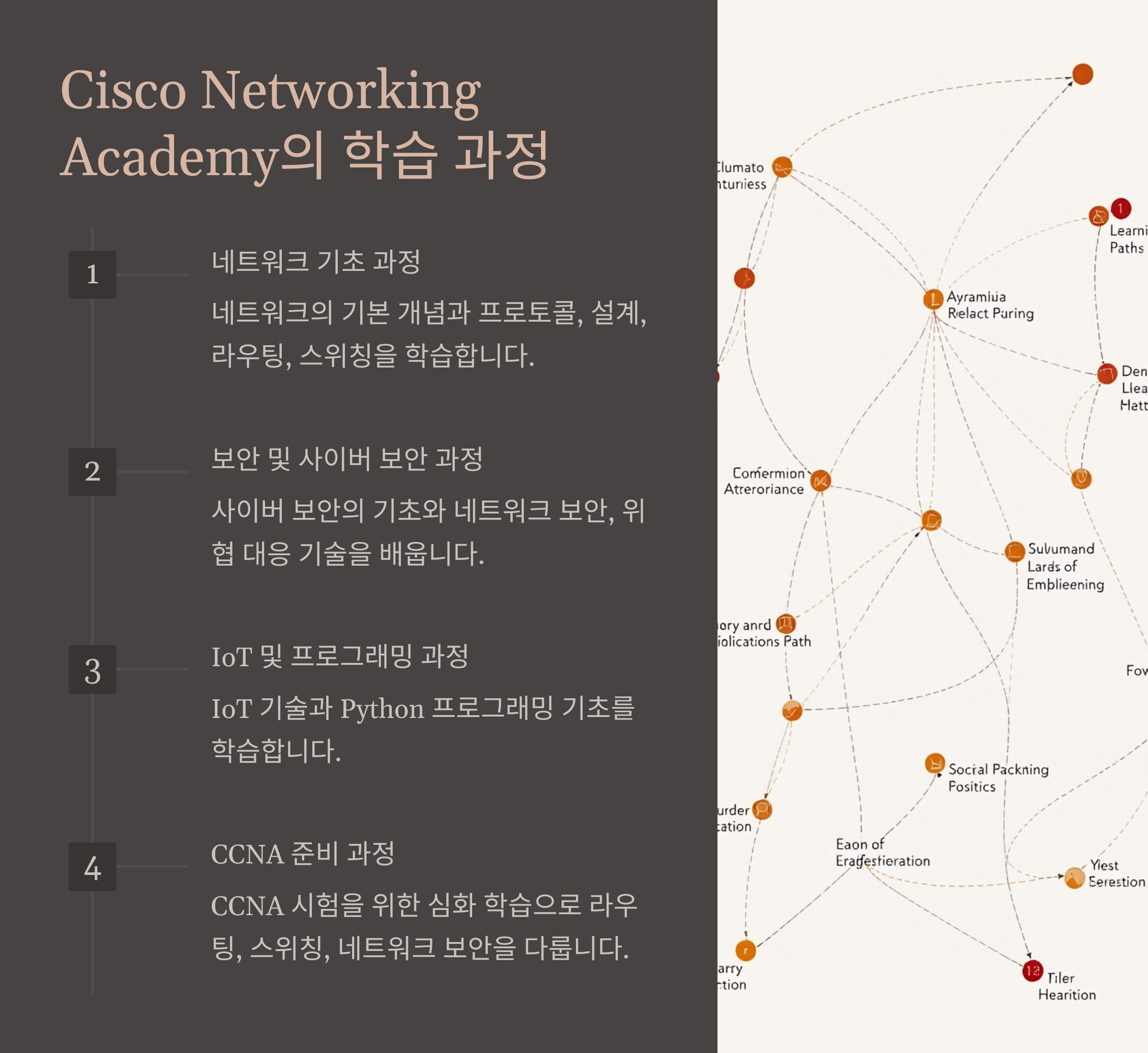 Cisco Networking Academy(네트워킹 아카데미)는 Cisco에서 운영하는 글로벌 교육 프로그램으로, IT와 네트워크 기술을 학습하고 전문성을 쌓을 수 있는 플랫폼입니다. 네트워크, 보안, IoT, 프로그래밍 등 다양한 주제를 다루며, 초급자부터 전문가까지 모두에게 적합한 과정과 학습 자료를 제공합니다.