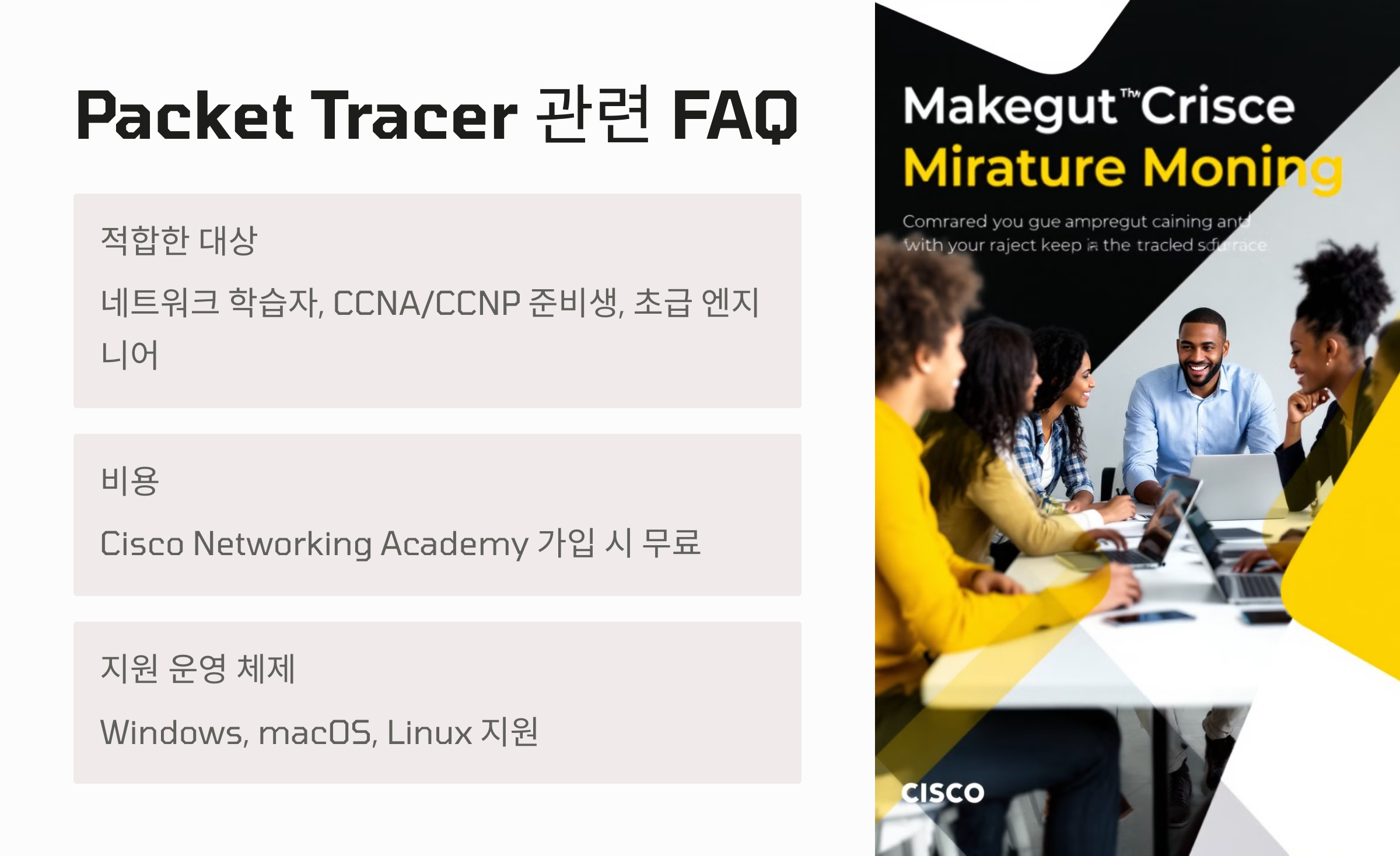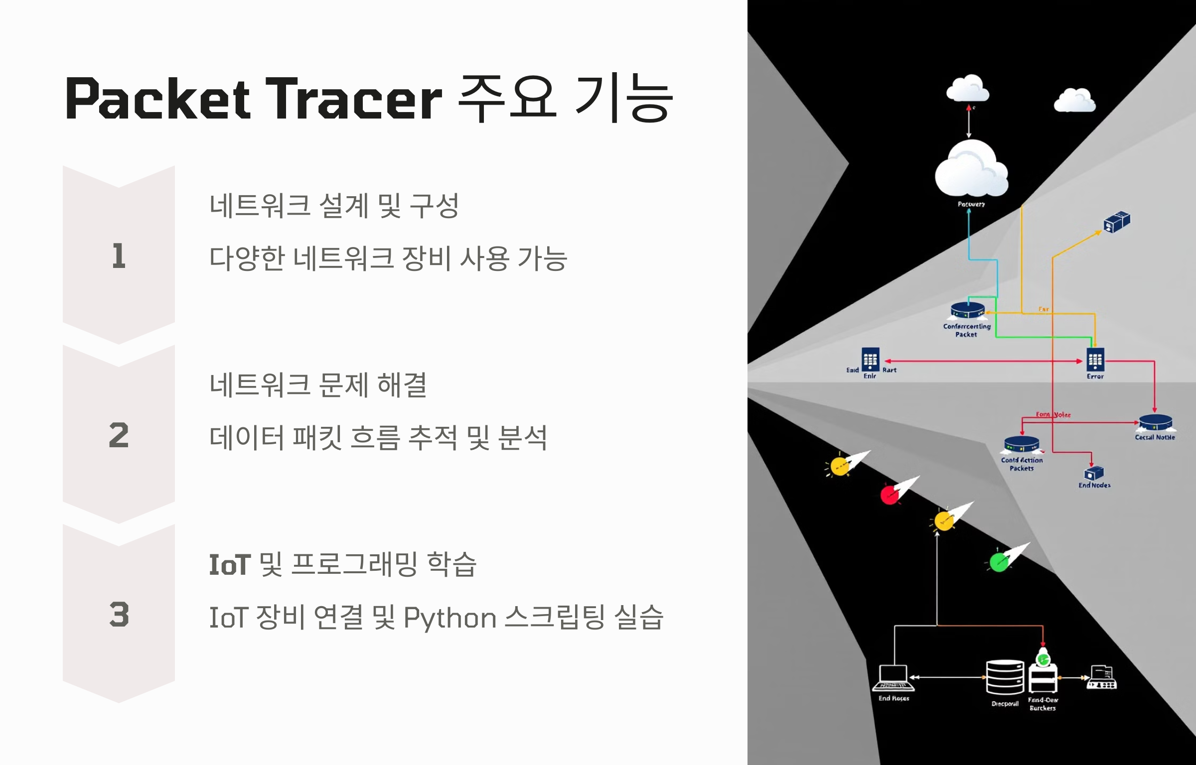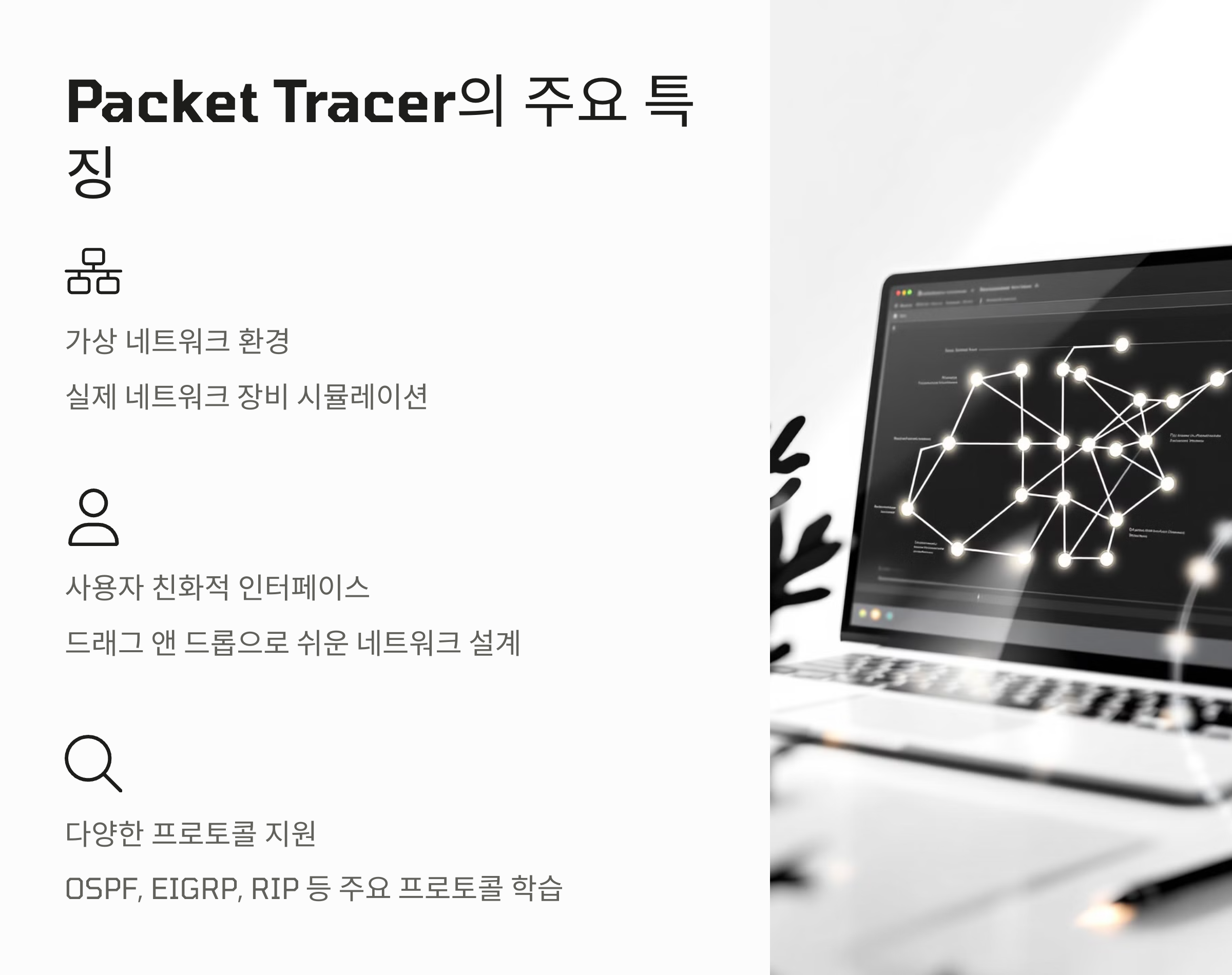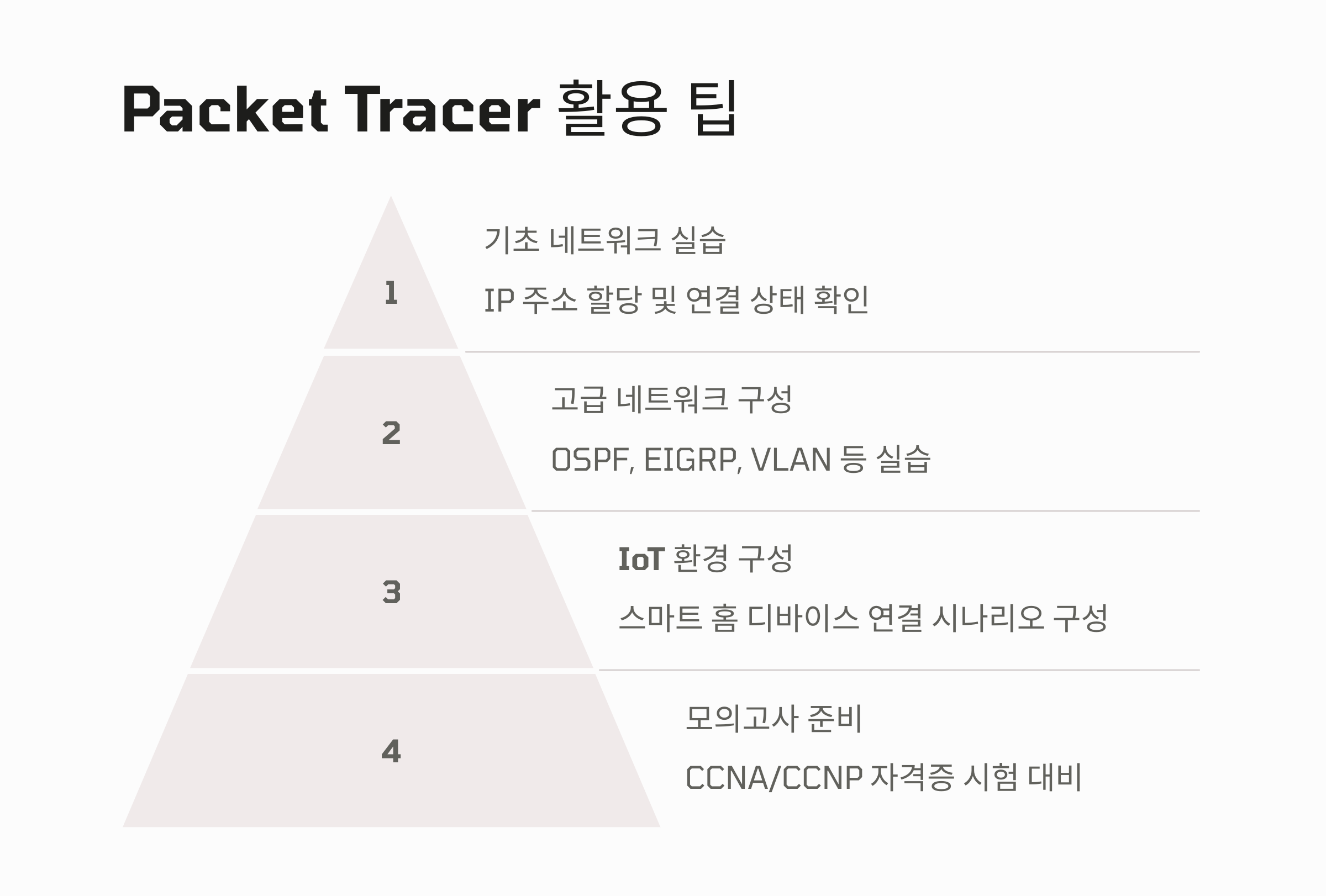 Cisco Packet Tracer는 Cisco에서 제공하는 강력한 네트워크 시뮬레이션 도구로, 사용자가 실제 네트워크 장비 없이 가상 환경에서 네트워크를 설계하고 테스트할 수 있도록 돕습니다. 특히, 네트워크를 학습하는 학생들과 전문가들이 CCNA, CCNP 등의 자격증을 준비하거나 실무 스킬을 연습하는 데 유용합니다.